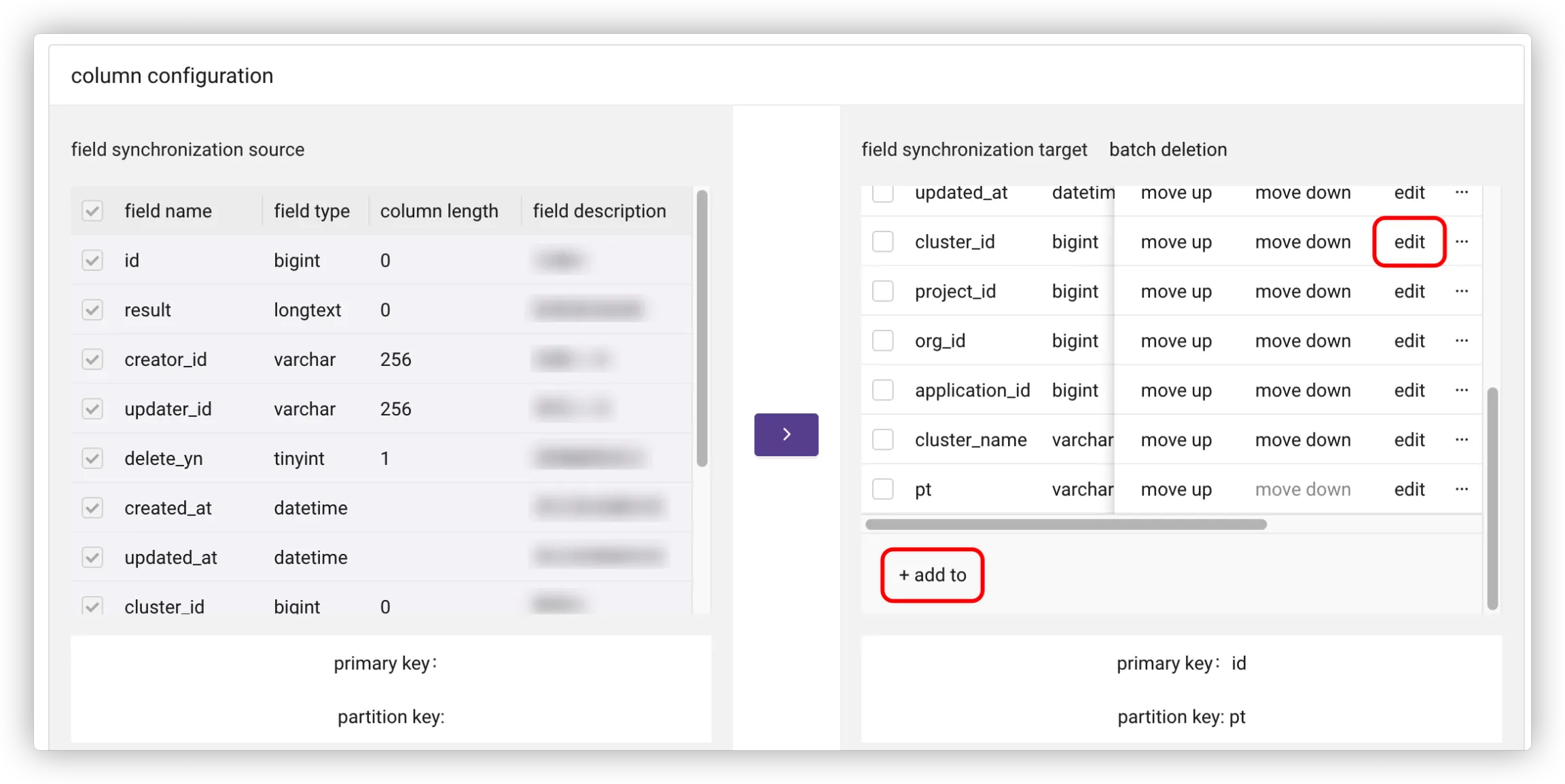 - Select the fields in the model, and click the arrow icon to synchronize to the cleaning table.