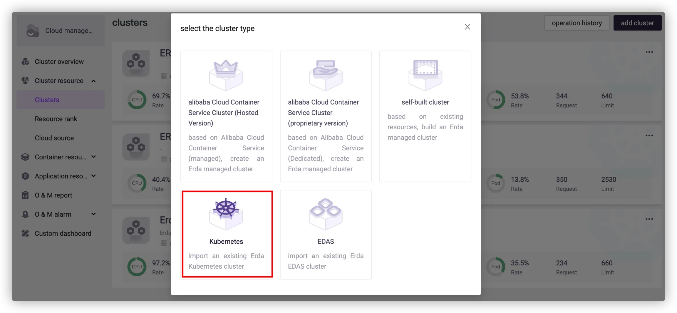 - Go to Cloud Management > Cluster Resource > Clusters and choose Import an existing Erda Kubernetes cluster.