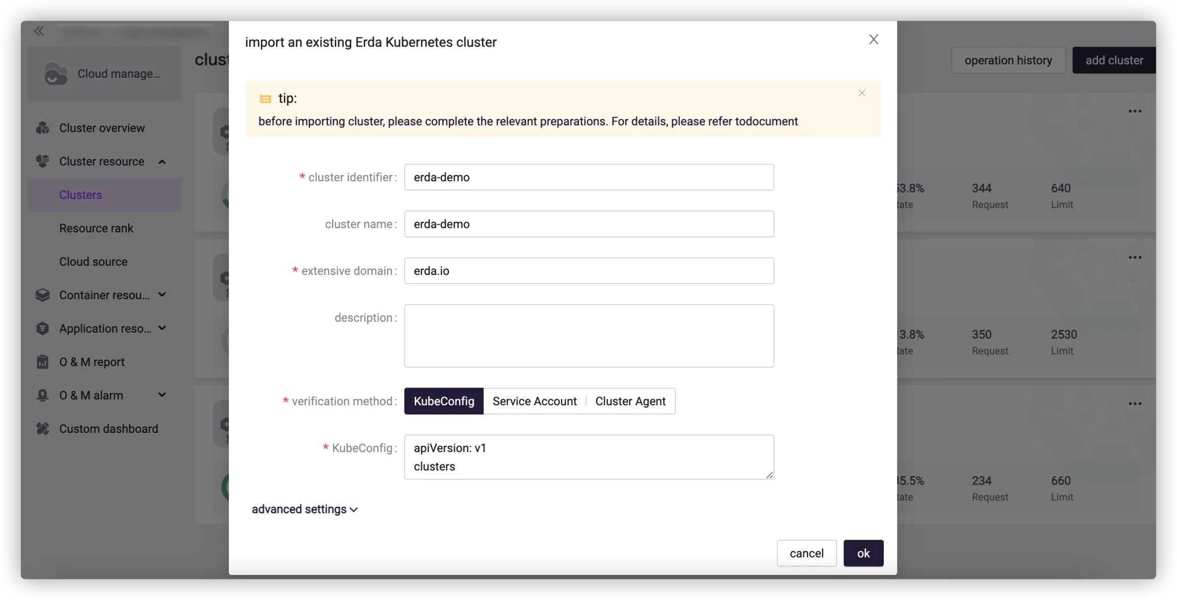 - Complete cluster configuration. For example, set cluster identifier as local-cluster, domain name as erda.io, and authentication method as Kubeconfig.