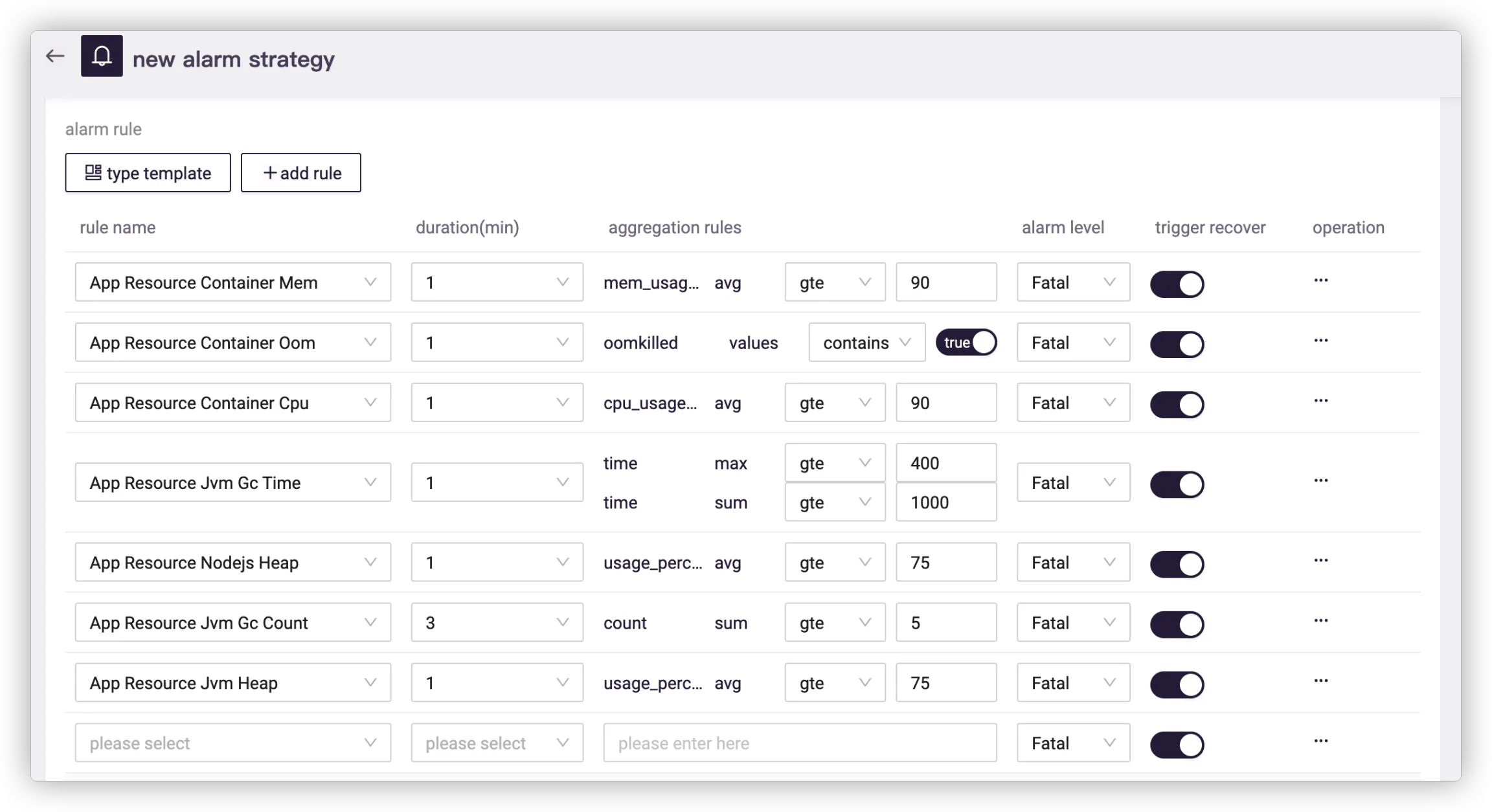 - Default: An alarm will be triggered when the average usage of NodeJS heap is greater than or equal to 75% for one minute.
