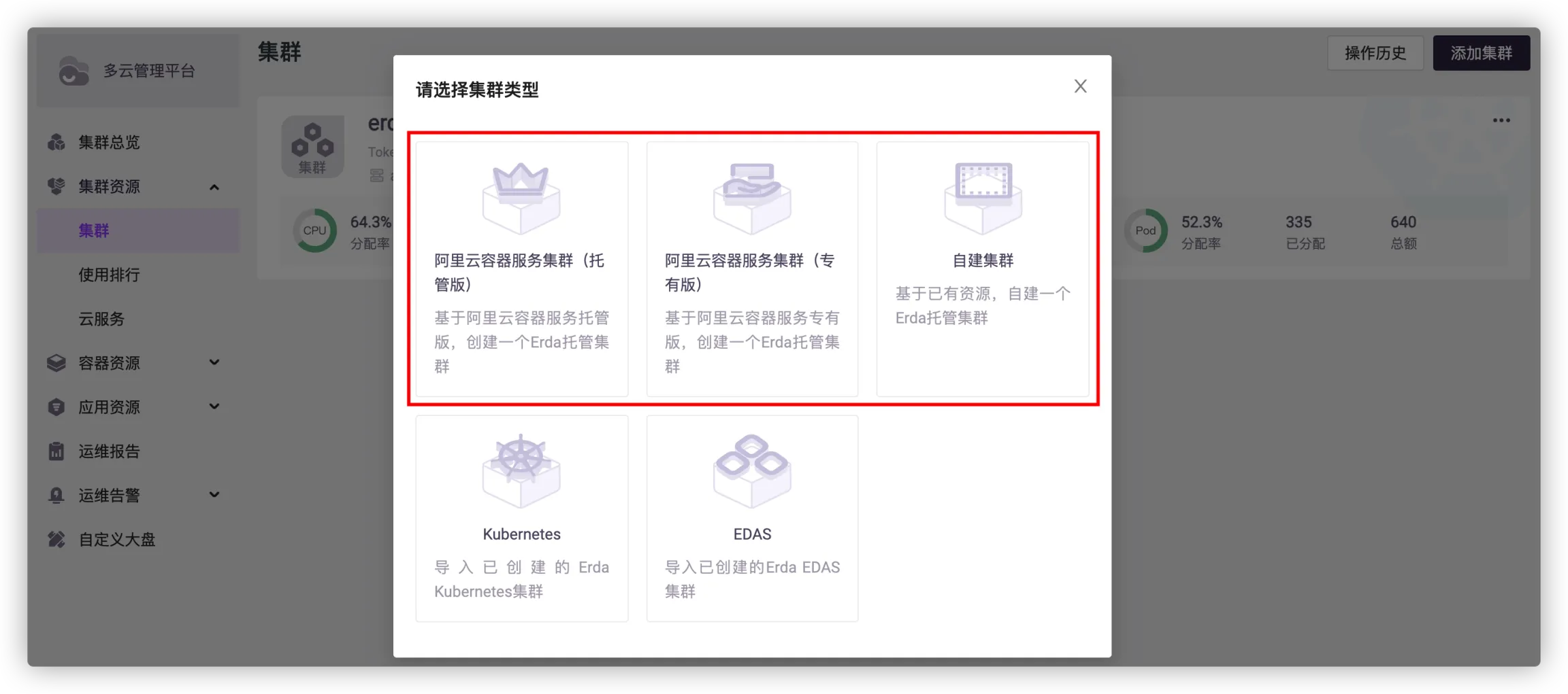请进入 多云管理平台 > 集群资源 > 集群 > 添加集群 > Kubernetes(导入已创建的 Erda Kubernetes 集群) 操作。