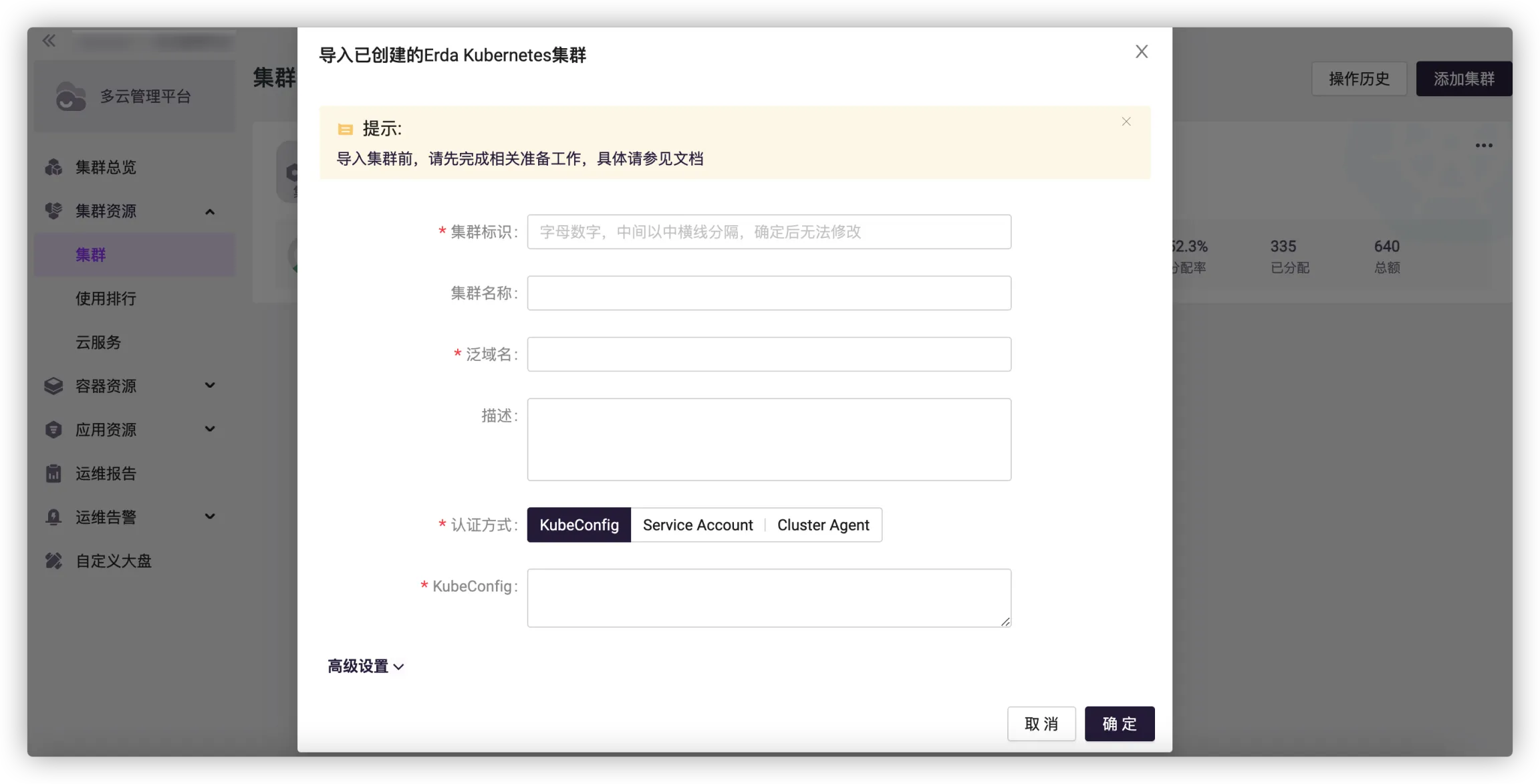 Erda 要求导入的集群满足相关条件,具体请参见 安装要求。导入集群前,您需要对集群进行一些简单的配置,具体请参见 准备工作。