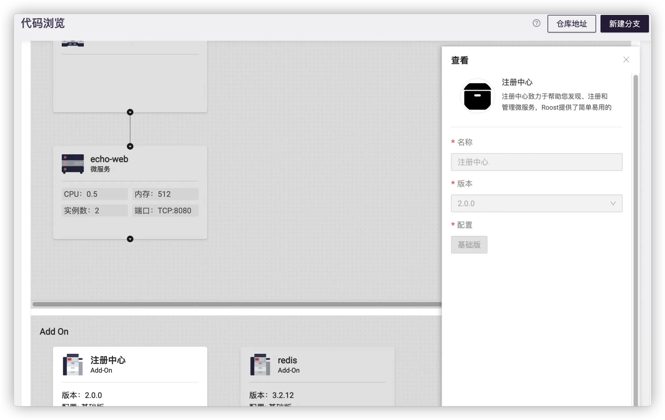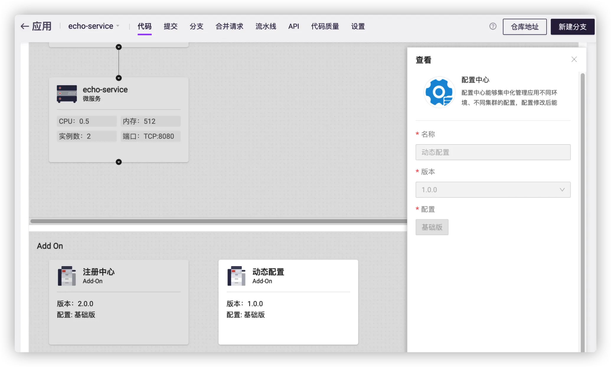 编辑 echo-web 和 echo-service 两个应用的 dice.yml,增加 Addon 注册中心。