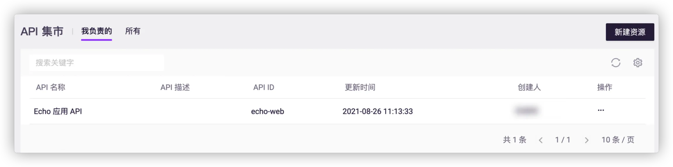 进入 DevOps 平台 > API 管理 > API 集市,点击 echo 应用 API 的 管理 选项。