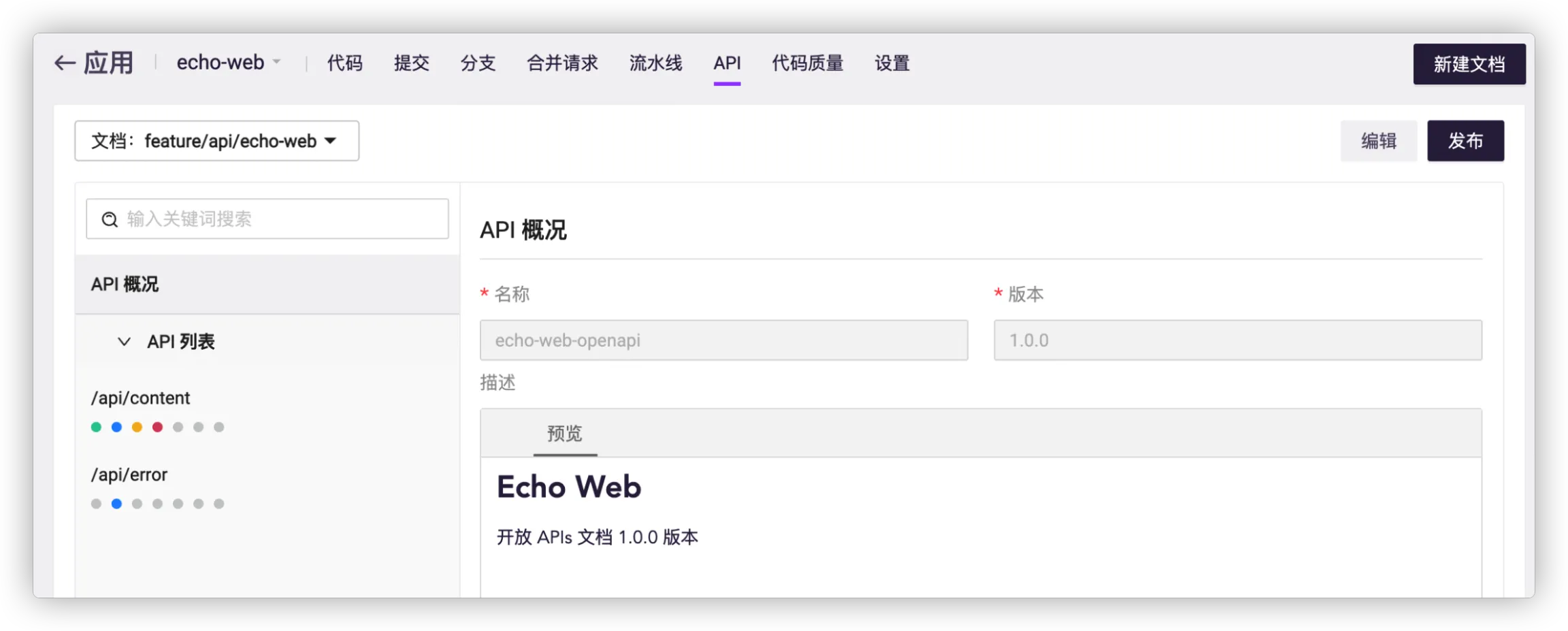 进入 echo-web 应用 > API > 新建文档,选择分支 feature/api,名称为 echo-web。