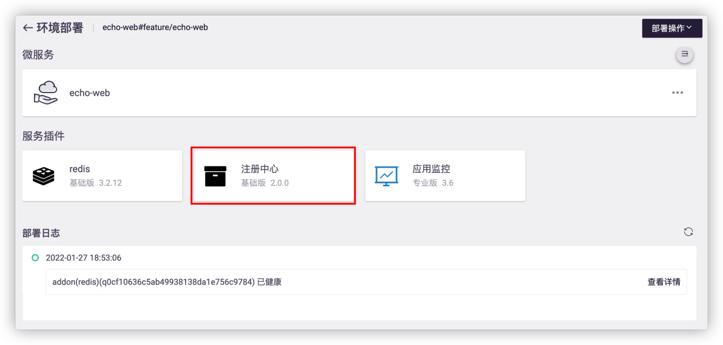 完成以上代码后,再次执行 echo-web 和 echo-service 的流水线,随后即可在 环境部署 看到 注册中心。