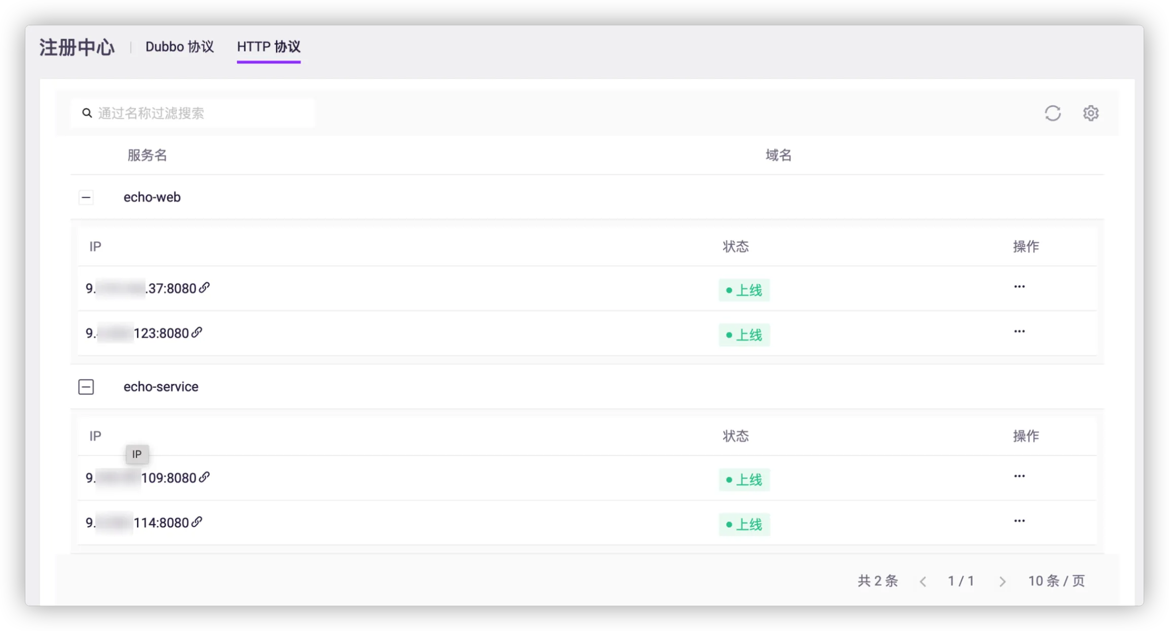 点击 注册中心,或进入 微服务治理平台 > 服务治理 > 注册中心,查看 HTTP 协议。