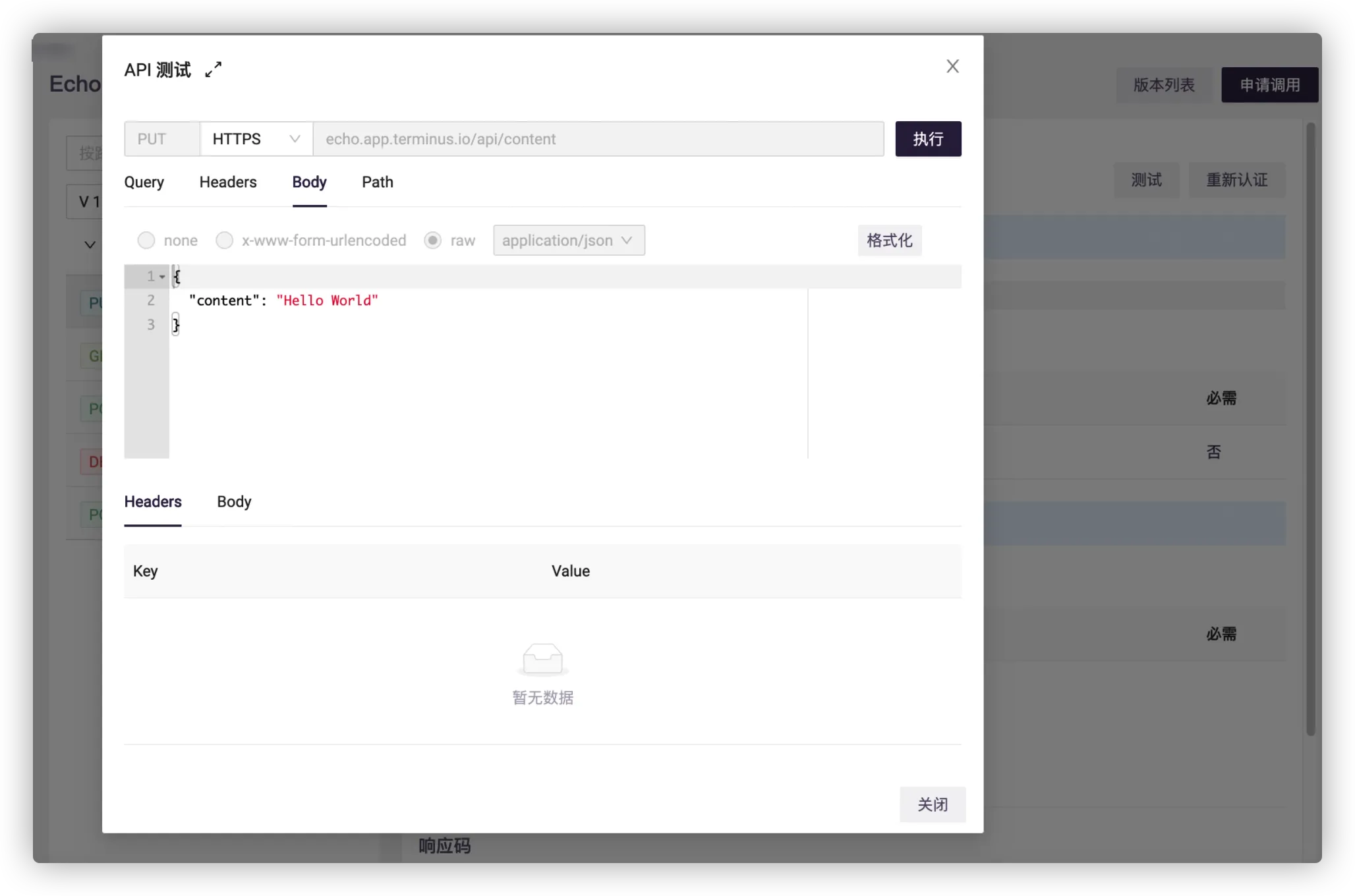 1. /echo/content 1. Method: GET Response MediaType: application/json 类型: ContentResponse 2. Method: PUT Body MediaType: application/json 类型: ContentRequest 3. Method: POST Body MediaType: application/json 类型: ContentRequest 4. Method: DELETE Response MediaType: application/json 类型:Object 参数名称: deleted, 类型: Boolean 1. /echo/error 1. Method: POST Body MediaType: application/json 类型:Object 参数名称: type, 类型: String进入 DevOps 平台 > API 管理 > API 集市 查看、管理 API。