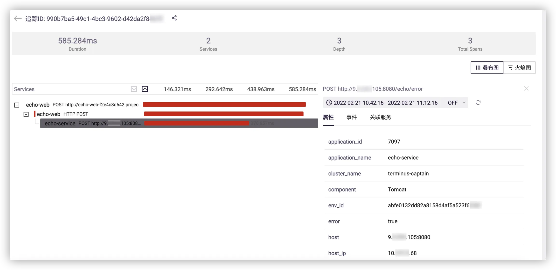由上图可以看出,echo-service 的 /echo/error 接口耗时 500+ 毫秒导致慢请求。