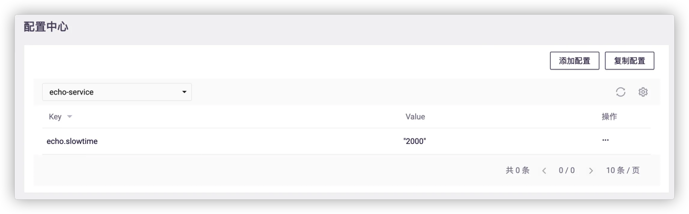 在 echo-service 应用的 环境部署 点击 配置中心,或进入 微服务治理平台 > 服务治理 > 配置中心,设置 echo.slowtime 的值: