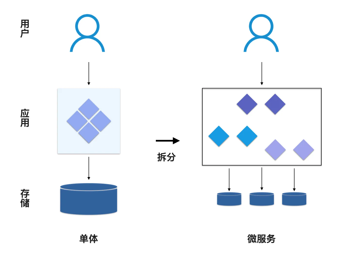 微服务架构相较于传统的单体应用,最大的变化在于服务拆分,具体来说是根据业务领域进行业务组件拆分,例如采用领域驱动设计(DDD),按照业务领域划分为多个微服务,服务之间相互协同完成业务功能。