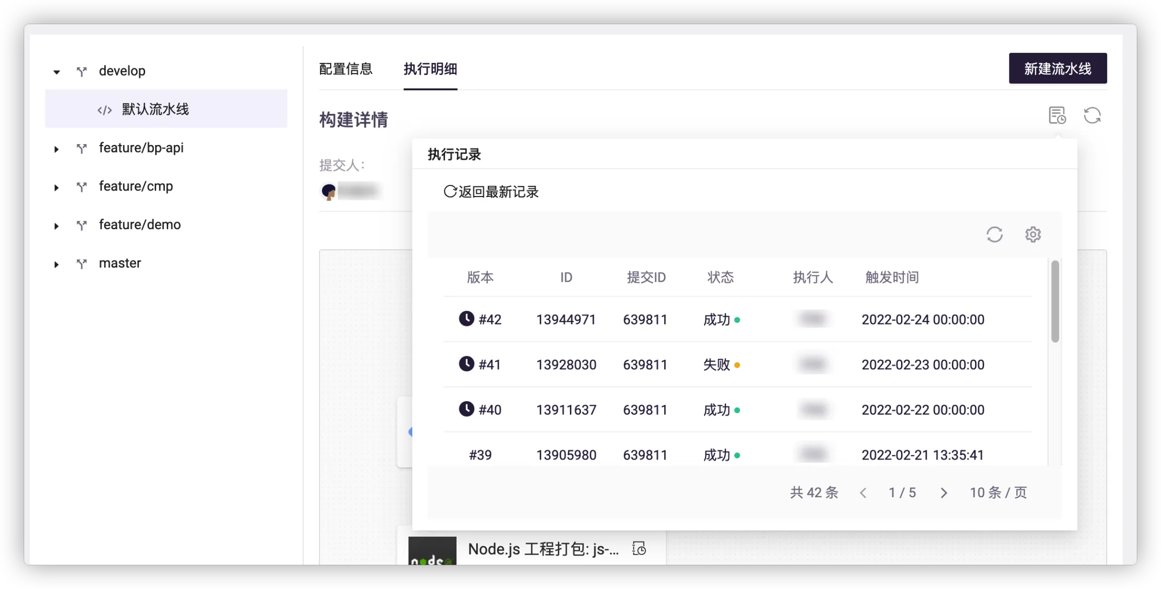点击右上角的执行记录按钮,可查看历史执行记录。点击相应历史记录后,流水线将切换为该历史记录,您可以查看相应的历史执行明细。