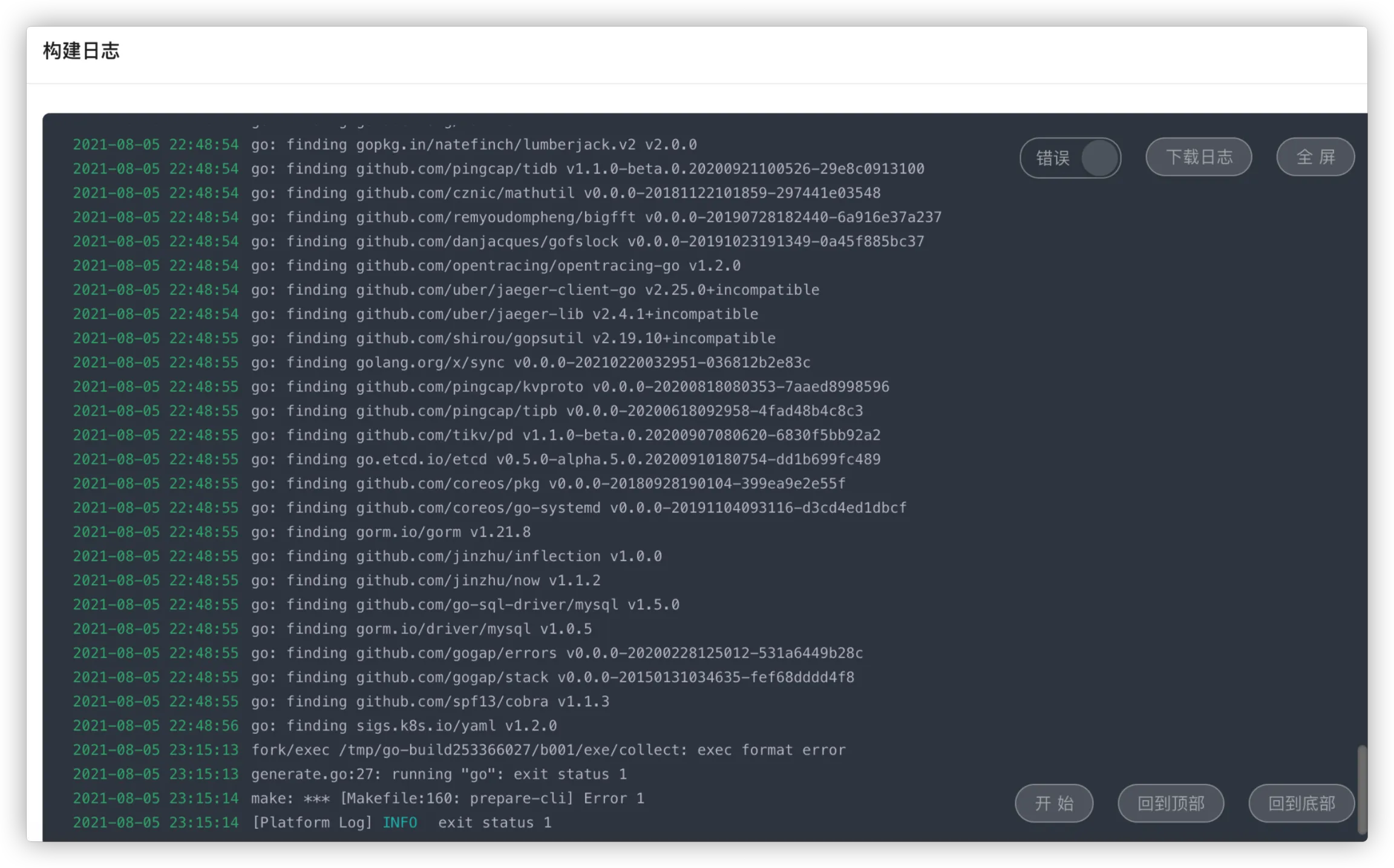 若流水线运行失败,错误日志中将体现具体的错误信息。