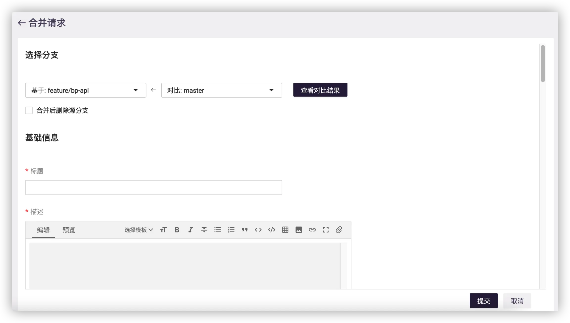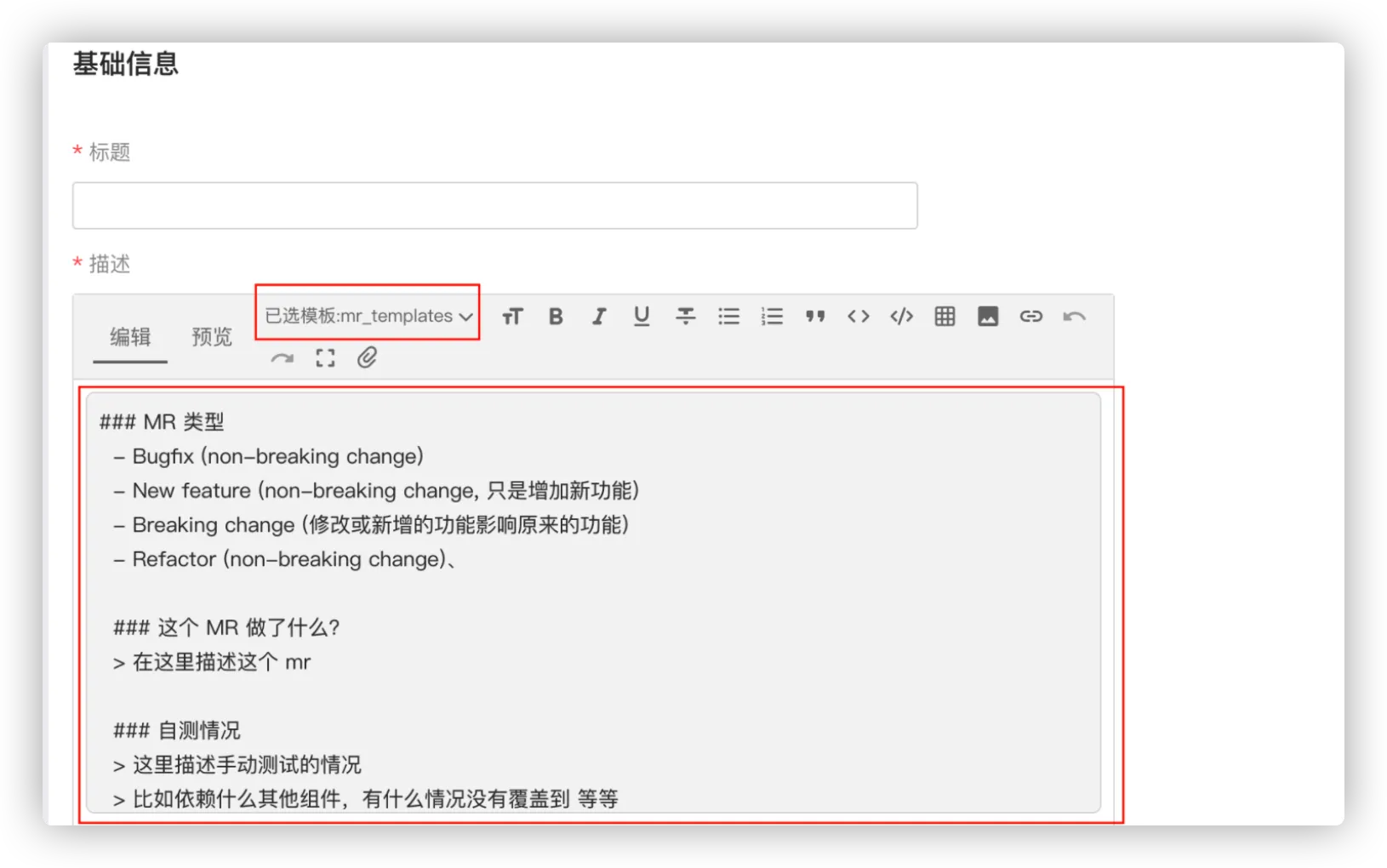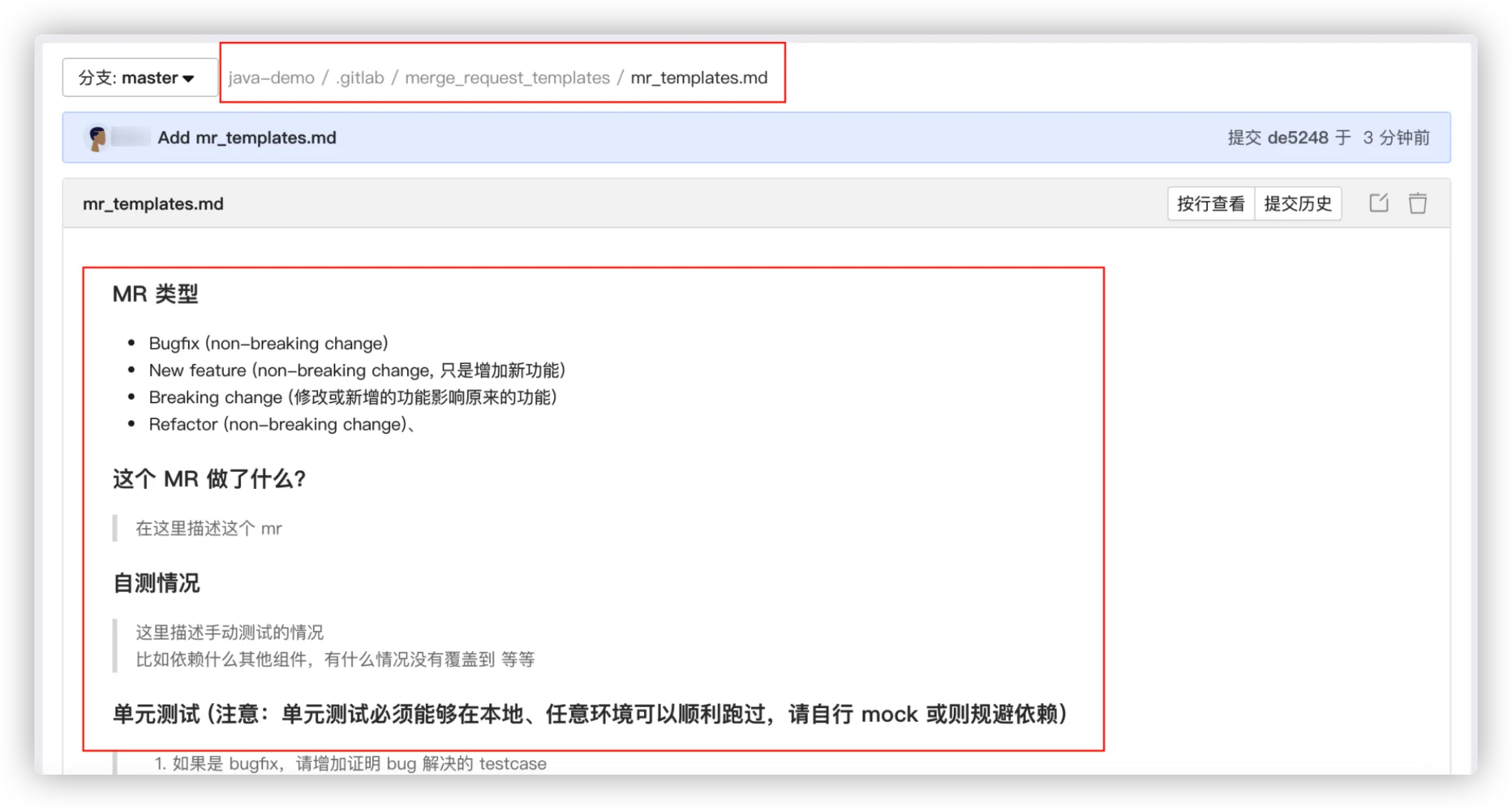 在默认分支 .gitlab/merge_request_templates 目录下添加模板 md 文件。