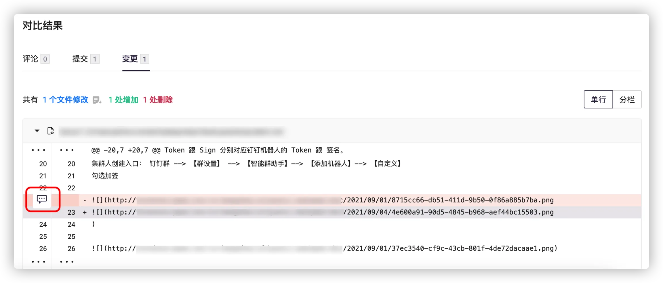 查看变更内容时,鼠标悬浮位置将出现对话按钮,点击按钮可添加评论。