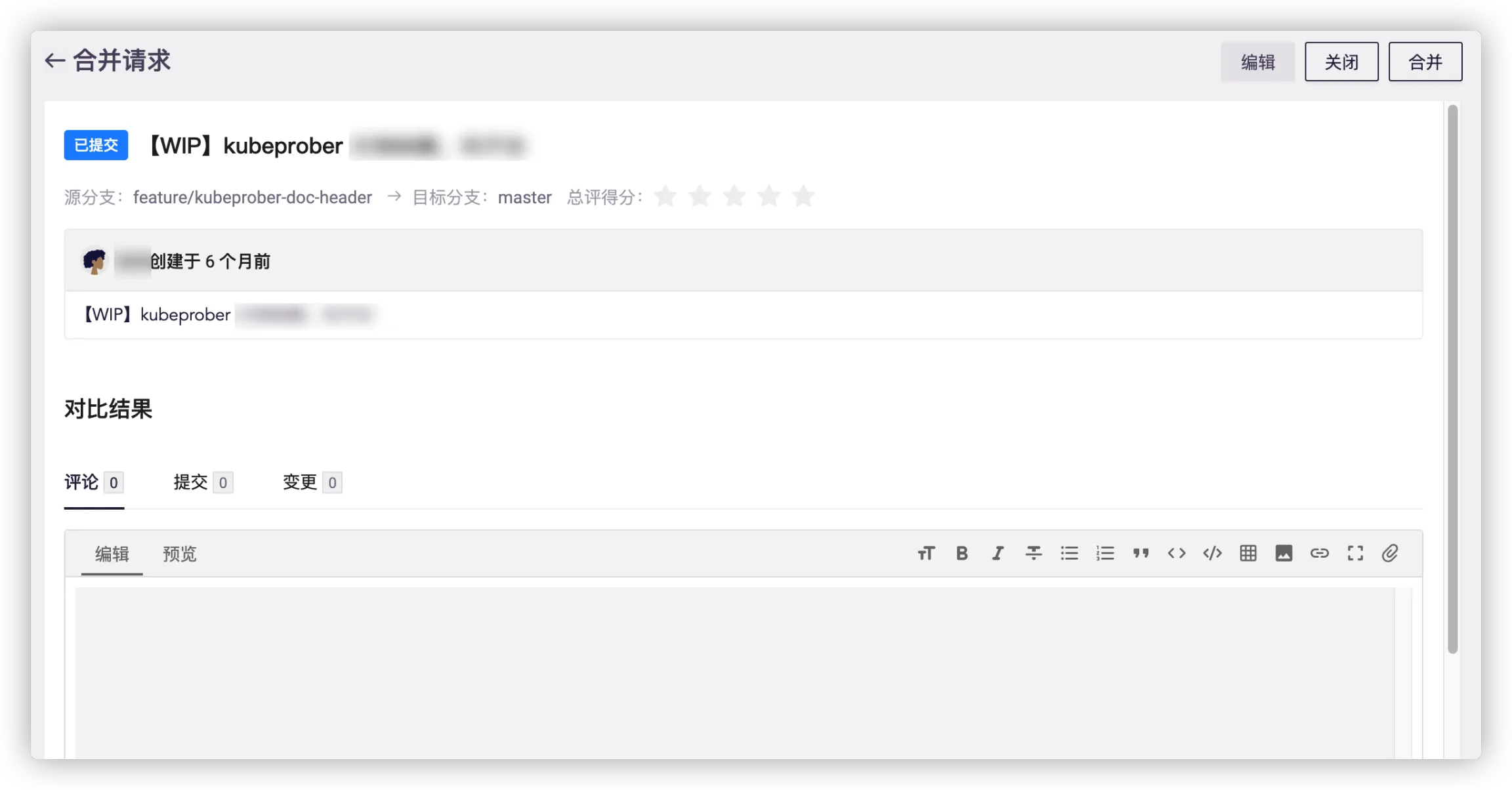 完成合并请求添加后,点击该合并请求,可查看合并请求信息以及对比结果,您可在对比结果中查看评论、提交和变更。 点击右上角按钮,合并或关闭请求。