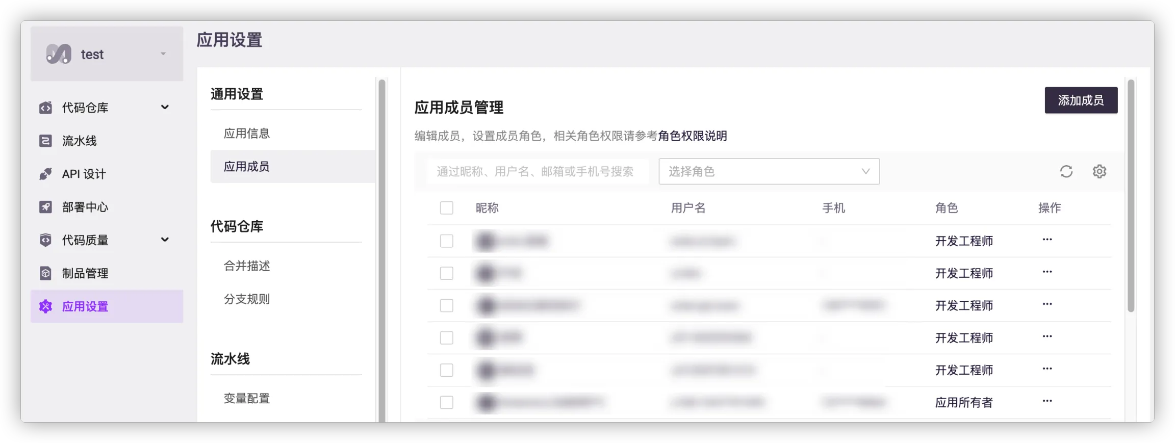 请进入 我的应用 > 应用设置 > 通用设置 > 应用成员 操作。