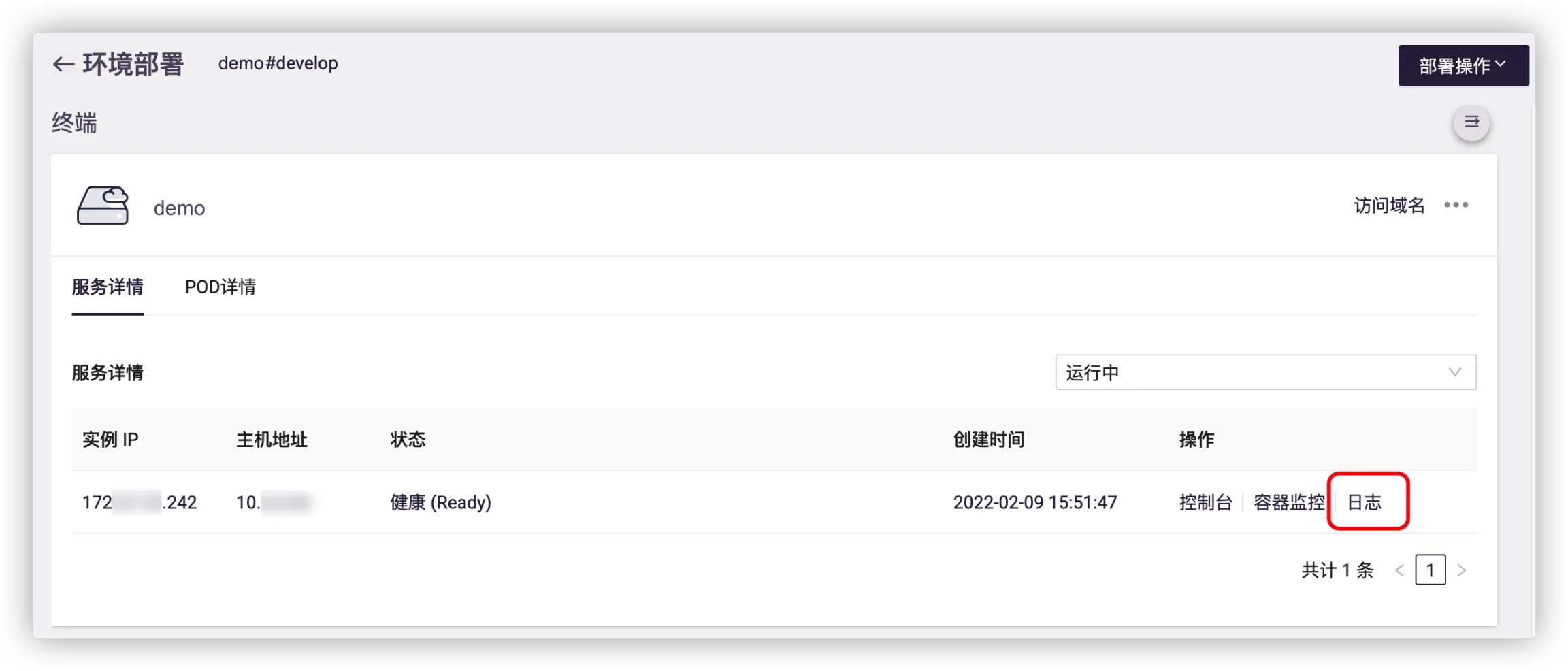 成功部署应用后,可进入应用的 Runtime 界面,点击查看日志按钮。