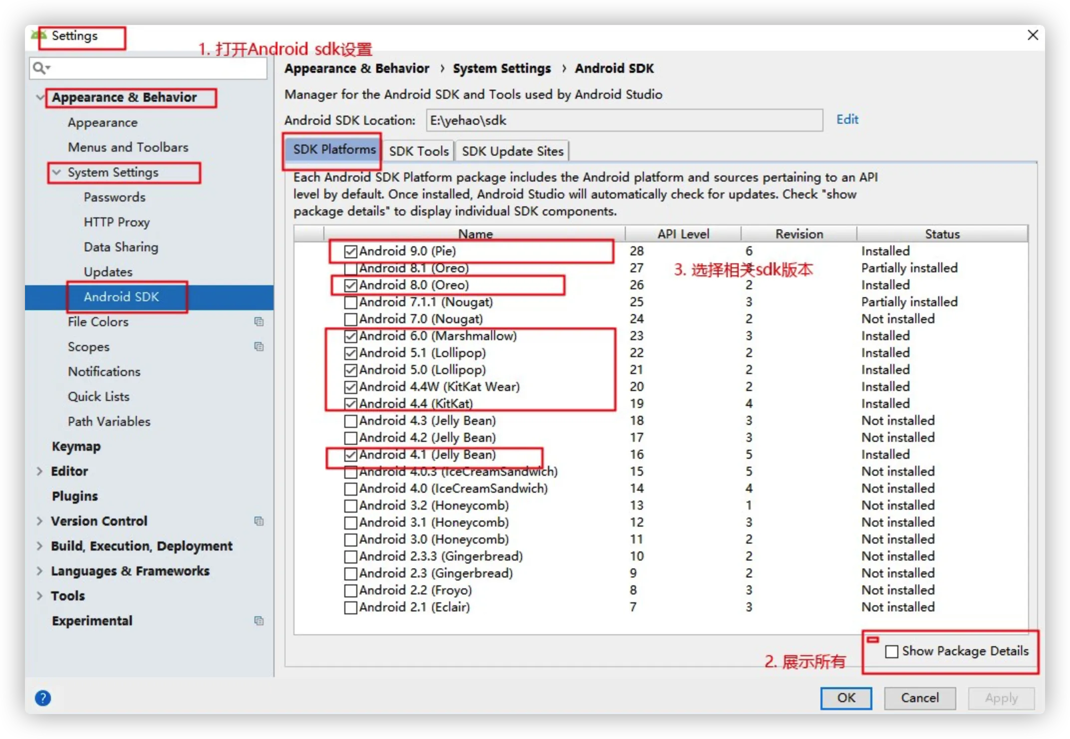 需要勾选 android 9.0,即 API Level 为 28, android 10.0 即 API Level 为 29