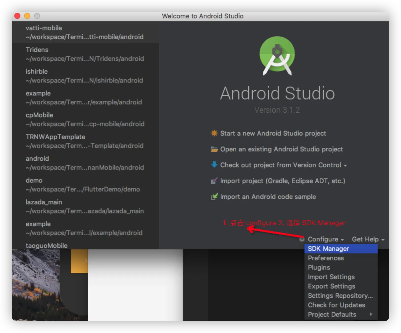 获取 SDK 目录。参考上边 Android 配置,在 Android studio 配置属性中找到 Android sdk Location 对应的路径。 然后参考文档 (opens new window)配置 adb 等常用命令行工具