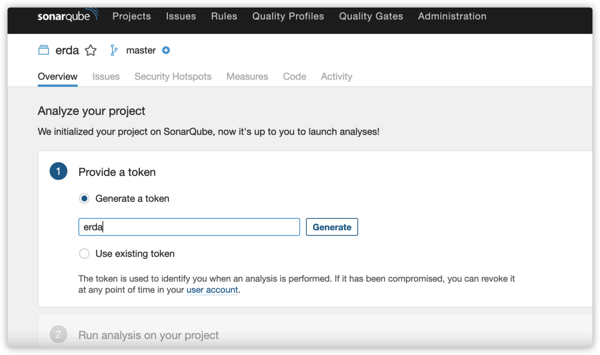 完成服务创建后,请在 SonarQube 中新建一个项目和 Token,用于后续的应用代码检查。