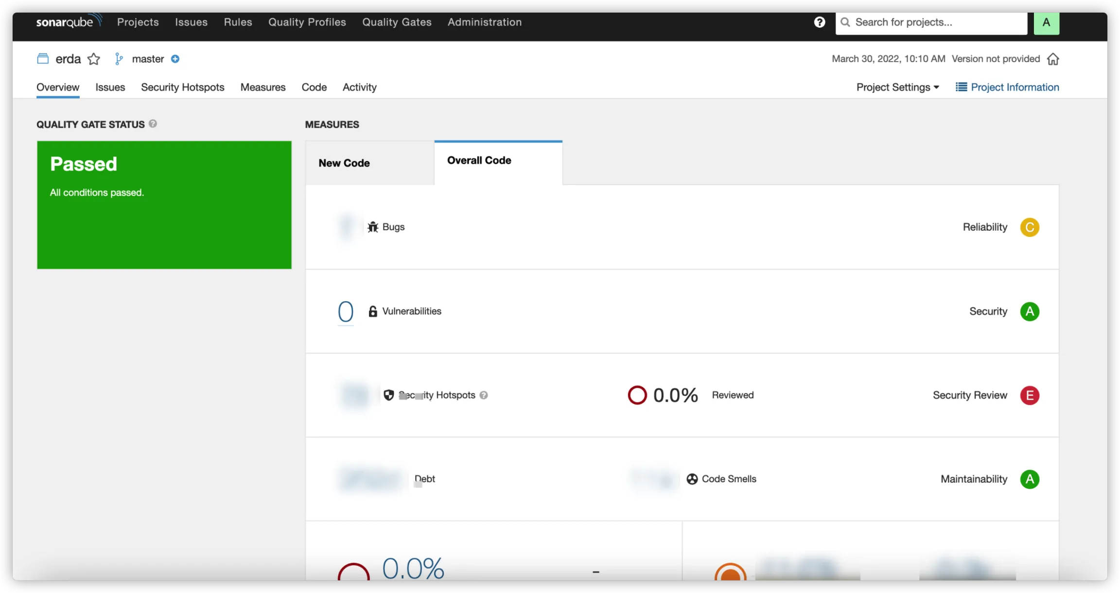 任意一项可区分每次扫描新增的数量。Sonar 质量报告从可靠性、安全性、可维护性、覆盖率、重复率等多方面对项目进行分析,并从 A~E 划分为 5 个风险等级,有助于您严格把关代码工程的质量。更多信息请参见 官方文档 (opens new window)。