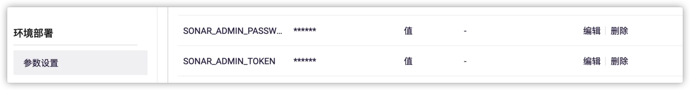 如需指定 Sonar 的管理员密码和 Token,可进入应用的 设置 > 环境部署 设置参数。