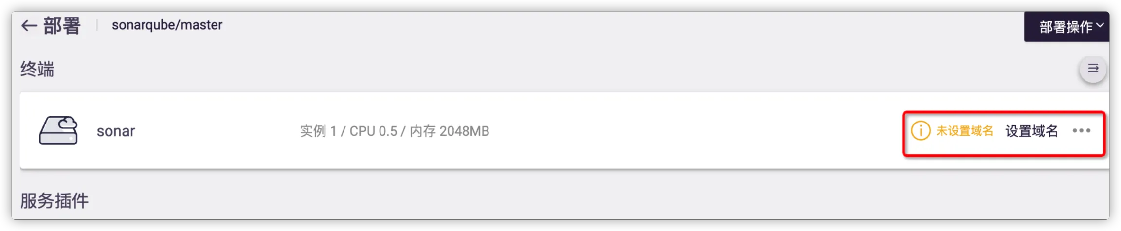 完成部署后,可进入部署中心点击 设置域名,开放 Sonar 服务。