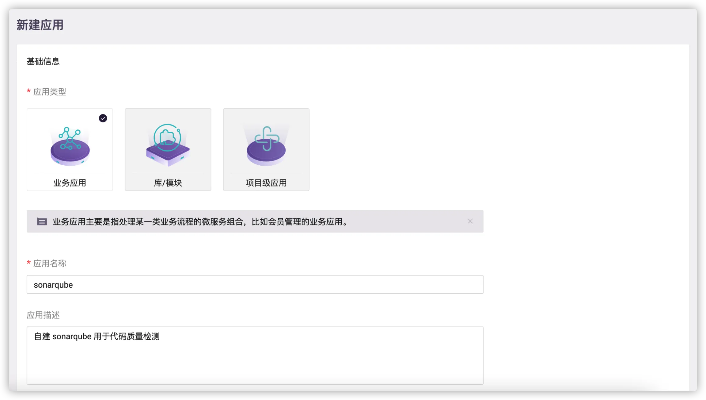 如需快速构建一个 Sonar 服务,请在项目下新建一个应用用于部署自建 Sonar,例如新建一个应用命名为 sonarqube(该示例仅供快速入门参考,不建议在生产环境中使用)。