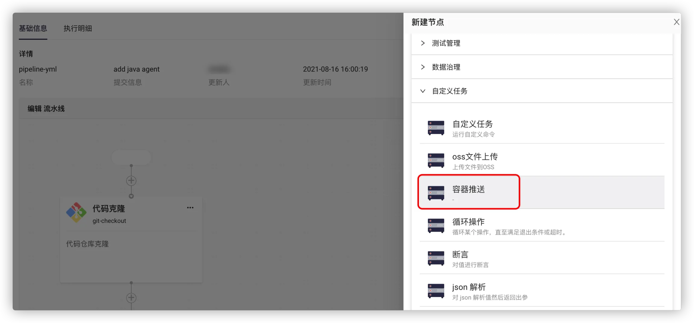 首先创建一个应用,编辑具备代码拉取、构建的 pipeline.yaml,再增加一个容器镜像推送的 Action 将打包好的镜像推送到 Docker Hub 中,具体操作步骤如下: