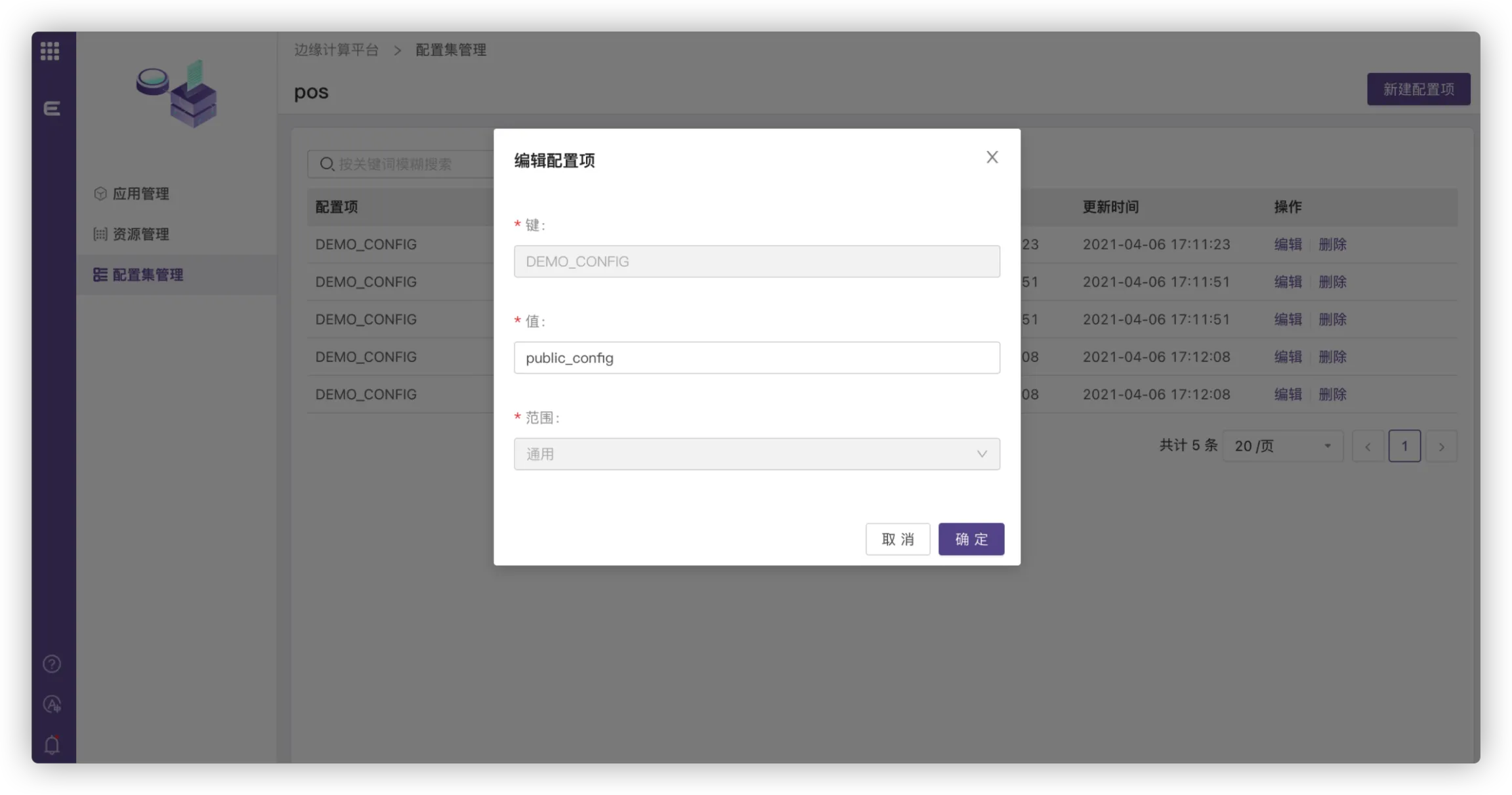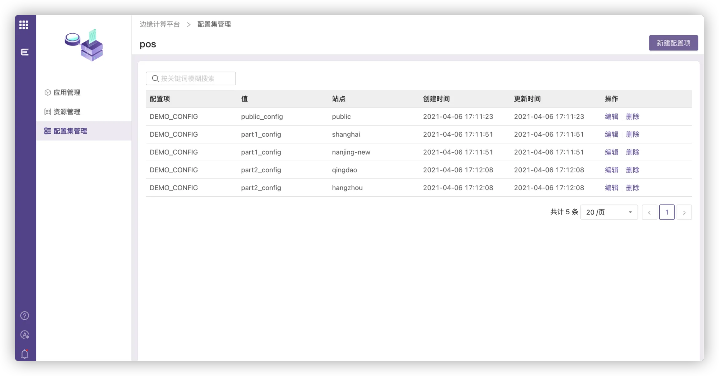 边缘计算平台提供配置集管理功能,用于解决边缘应用发布到不同站点之间的差异化配置问题。