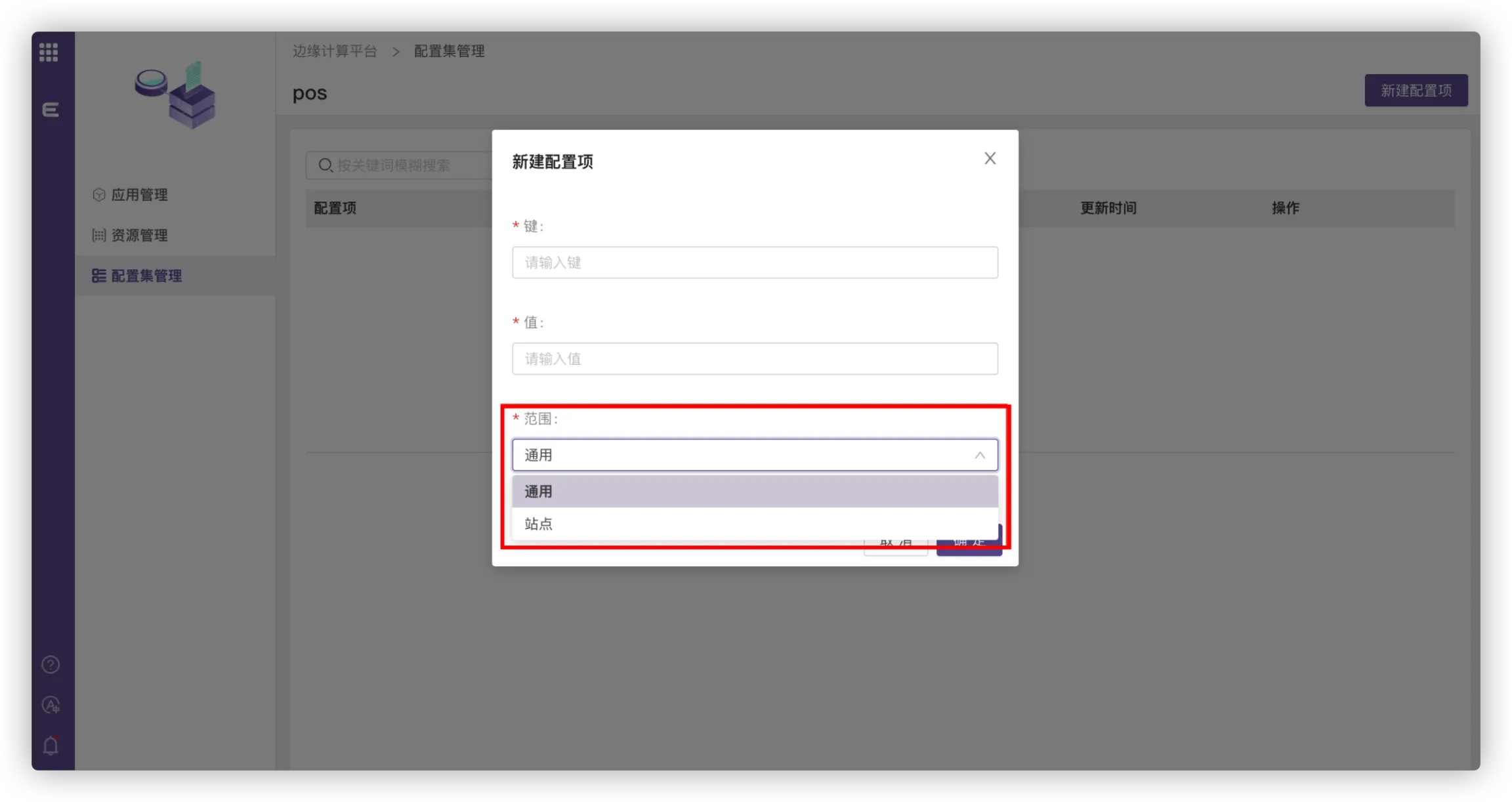 在 配置集管理 页面点击 详情 进入对应配置集,点击 新建配置项,配置项范围有如下两种类型: