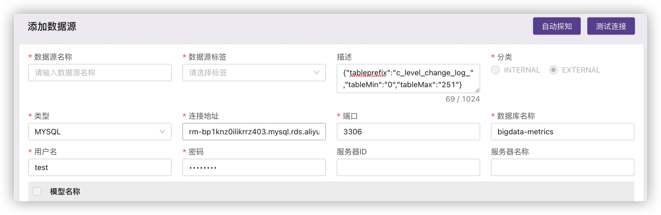 测试连接:点击确认数据源是否连通。若测试失败,请检查用户名或密码以及其他相关配置是否正确。