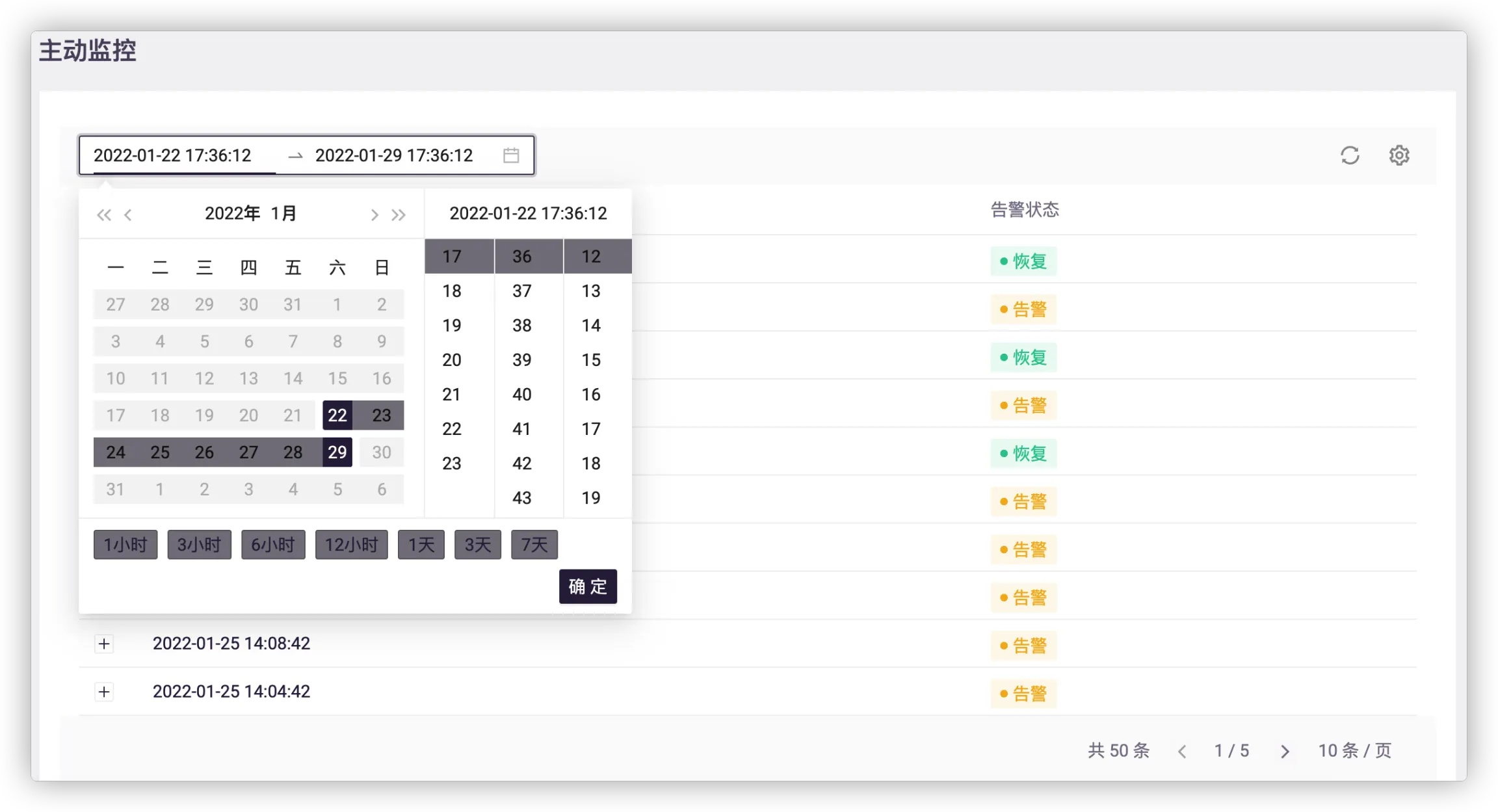 告警历史支持根据时间进行筛选,您最多可查看近7天的告警历史记录,时间范围可精确到秒。