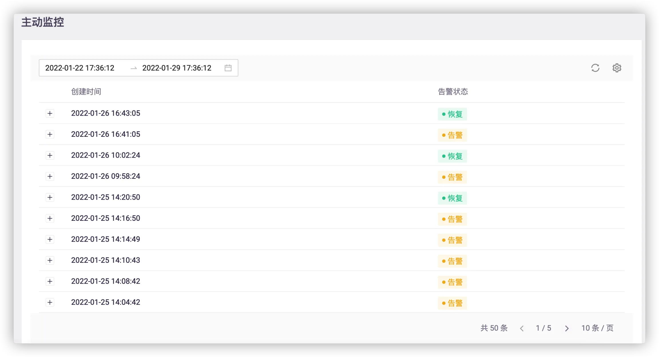 告警历史页将根据告警记录的创建时间倒序展示告警记录,同时展示告警状态(告警或恢复)。记录上方将显示触发该告警的策略名称。