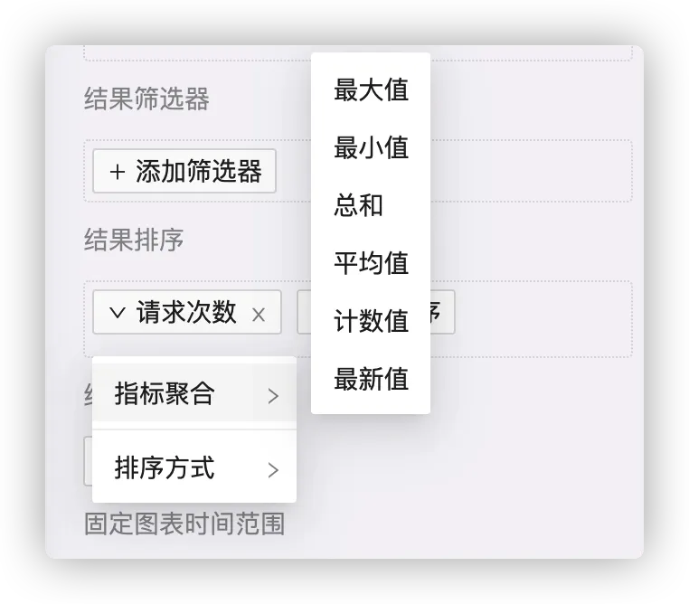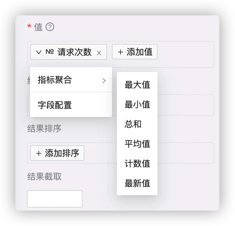 指标下的数据,也就是字段,可多选,添加请求次数与请求耗时平均值。添加后点击生成的标签,可对字段进行聚合操作,或设置别名。具体请参见 应用指标 。