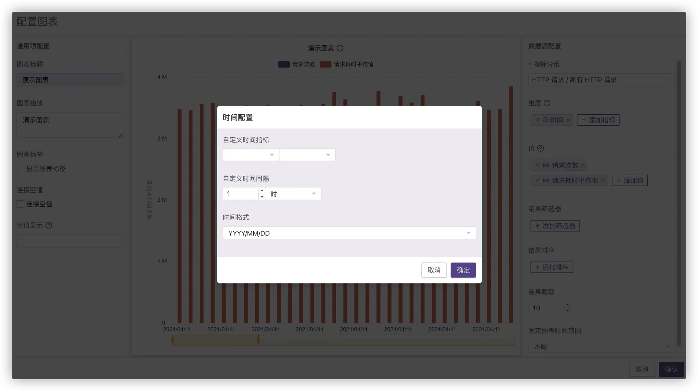 依据选定条件或者字段分组,选择1小时为间隔代表聚合每个小时的数据,便于分析,也可选择时间格式,即时间栏和数据详情的时间格式选择添加指标-时间,点击添加好的标签下的时间配置进入,如图所示: