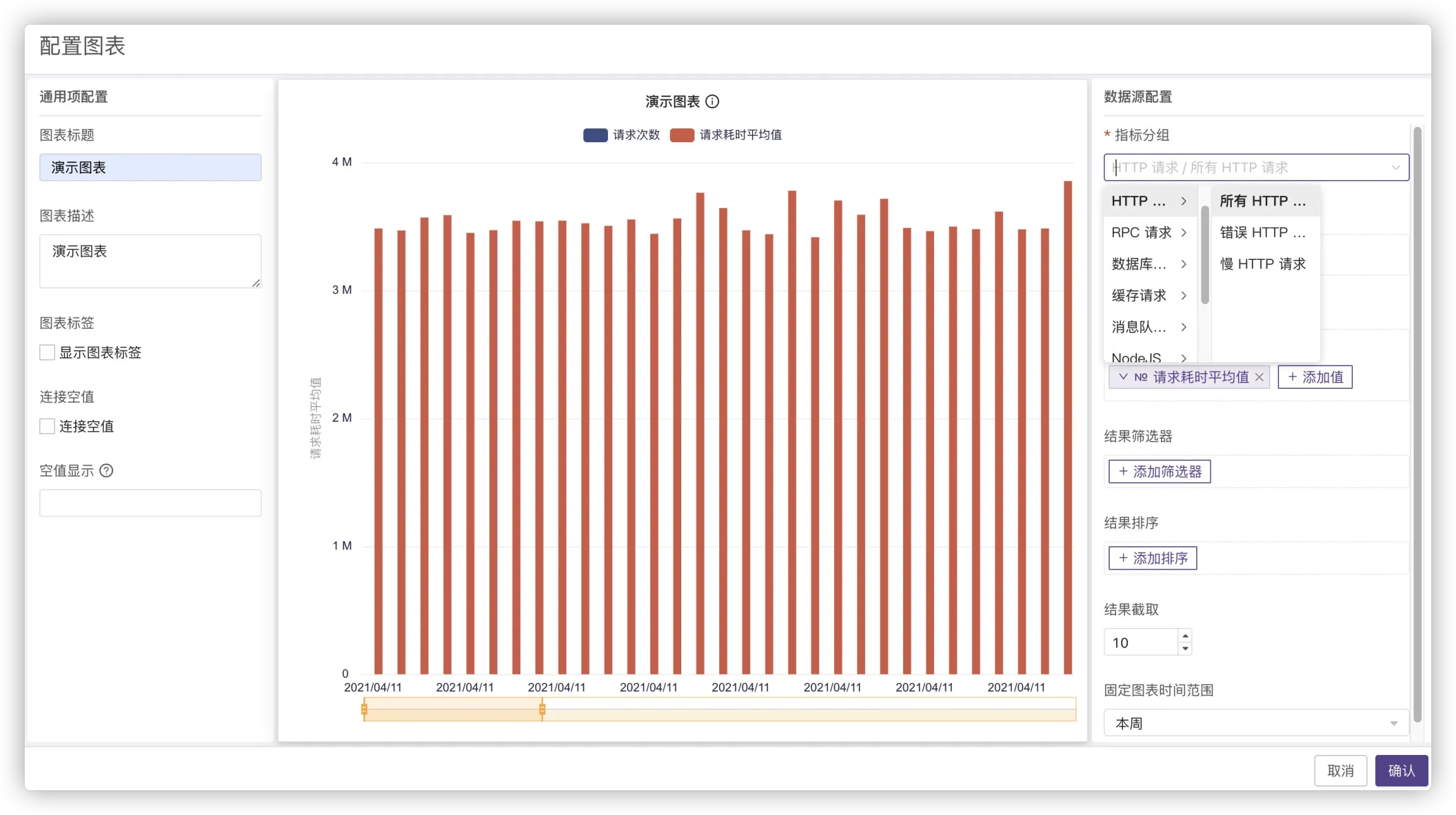 指标的数据源,也就是指标的类别,分为多级指标,一级指标是指标类别概览,二级指标是对一级指标的二次处理或细分,如慢HTTP请求。 选择HTTP请求-所有HTTP请求。