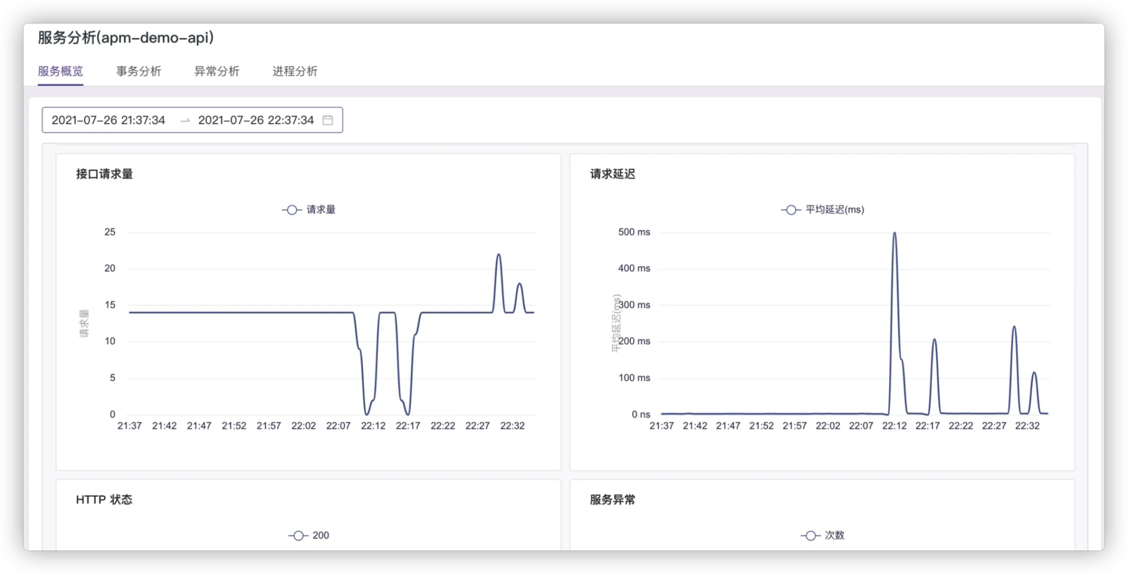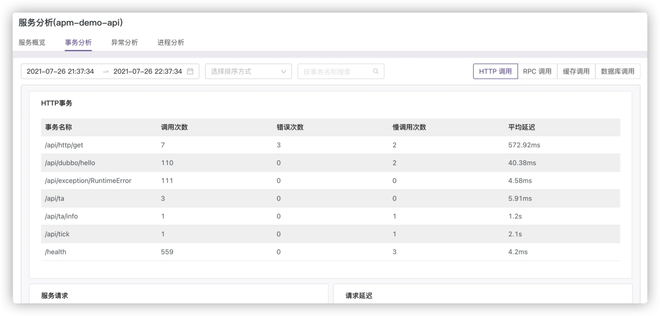 - HTTP 事务:每个事务接口在选择时间段内的平均响应时间、调用次数等信息。