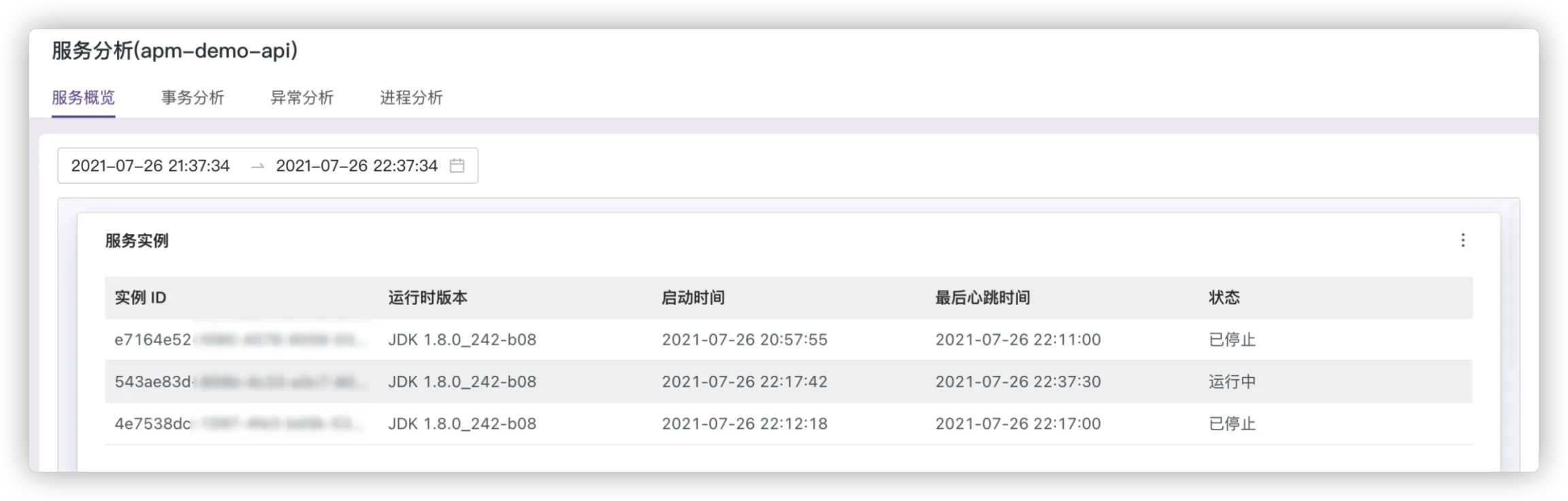 进程分析页展示应用中各模块的容器状态和 JVM 状态,且默认显示第一个模块。若一个应用下部署了多个实例,则默认显示第一个模块的第一个实例。