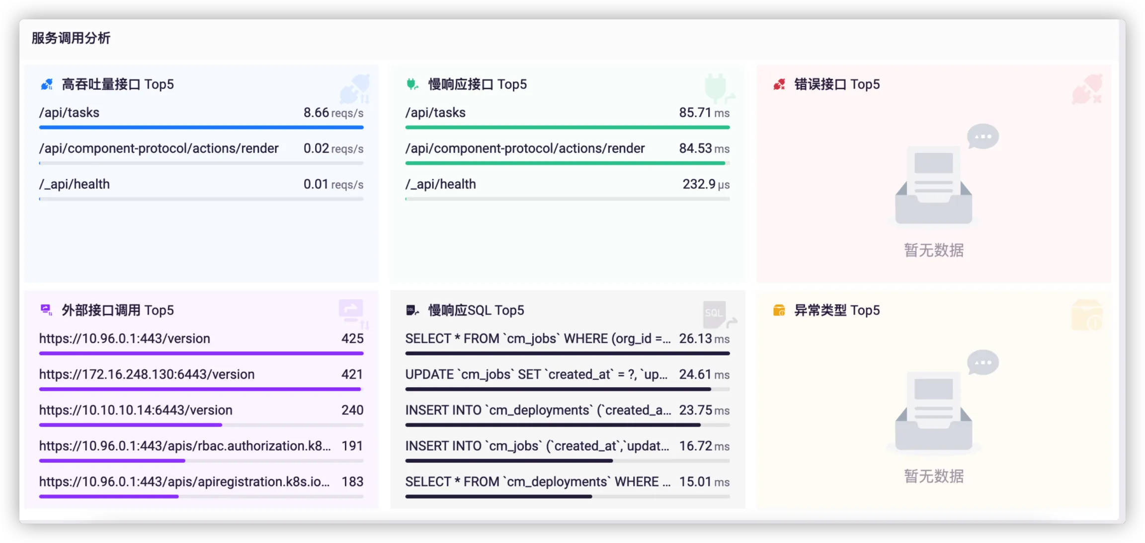 服务调用分析展示服务的高吞吐量接口、慢响应接口、错误接口、外部接口调用、慢响应 SQL 和异常类型的 Top 5 排行。