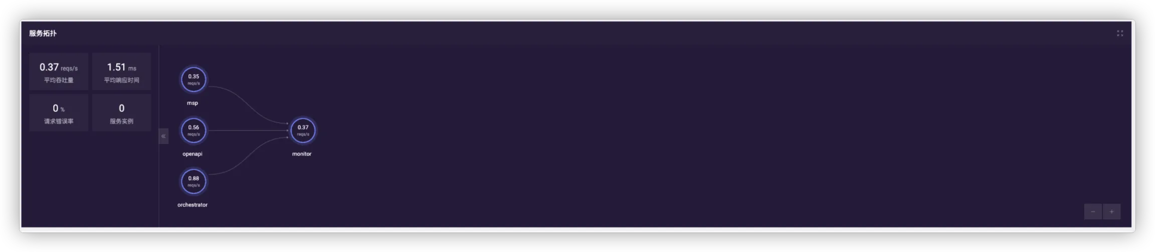 点击具体服务可进入对应服务监控页,在此查看该服务的拓扑图、服务请求概览和服务调用分析排行。