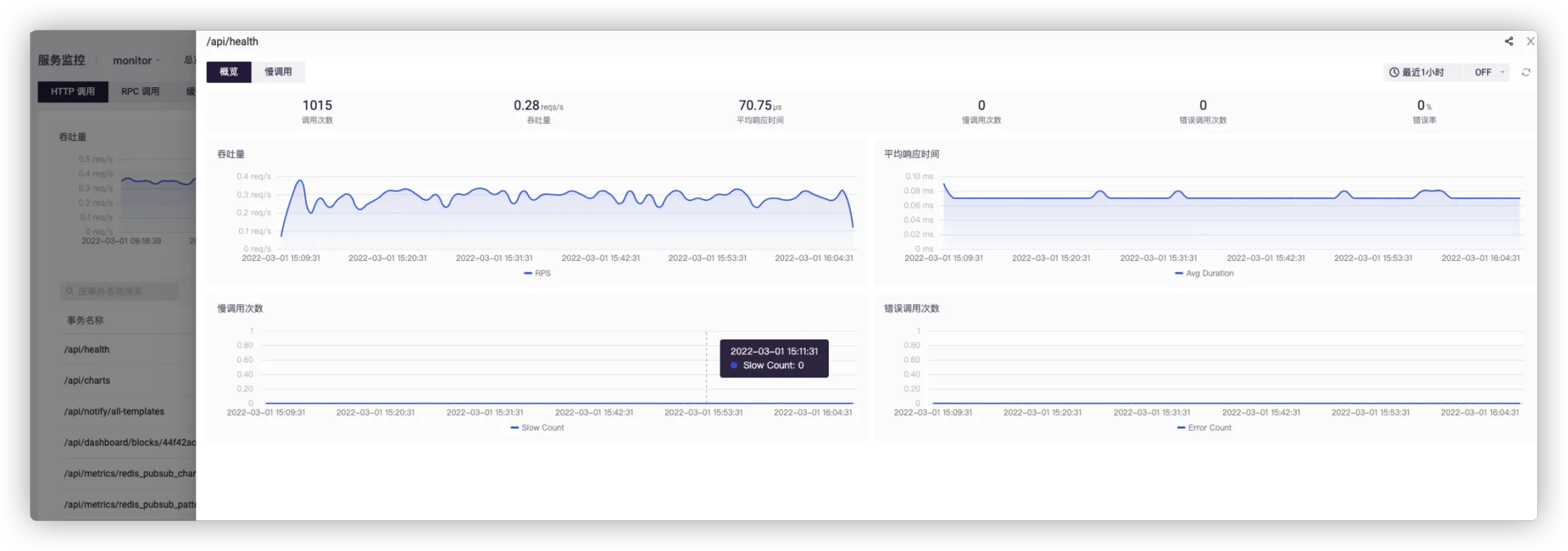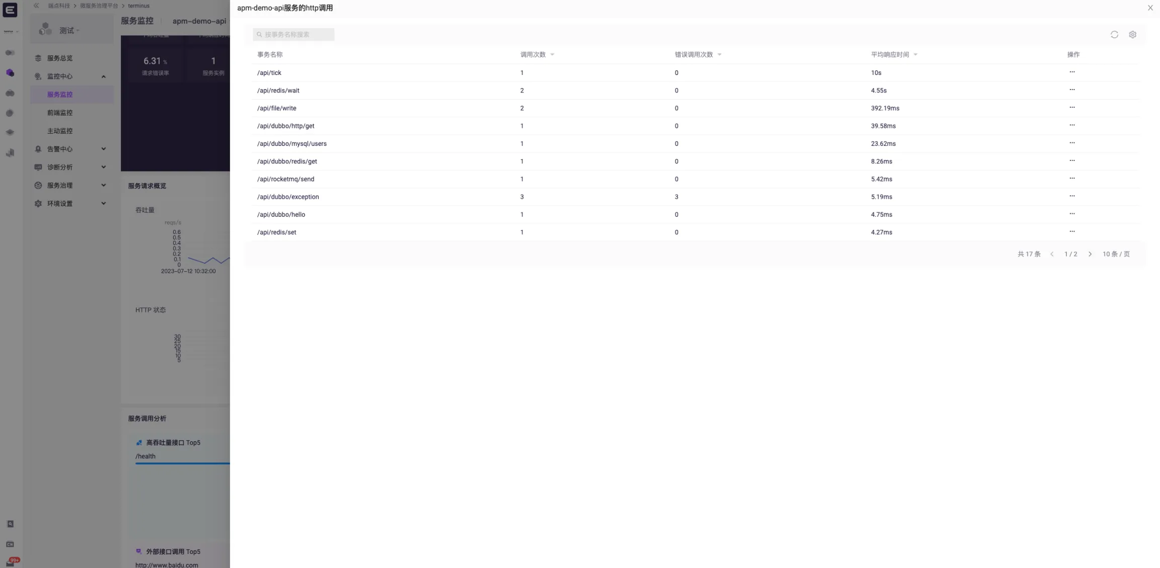 点击某事务名称,可查看其概览及慢调用情况。