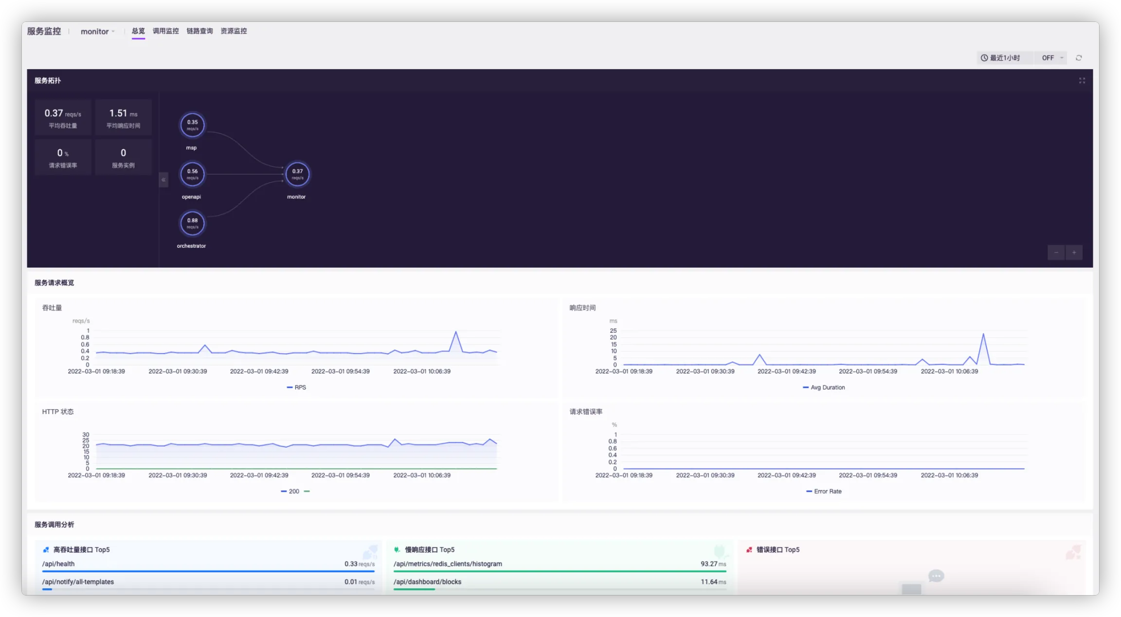 服务拓扑展示节点间的调用关系、平均吞吐量、平均响应时间、请求错误率和服务实例数。服务请求概览展示该服务的吞吐量、平均响应时间、HTTP 状态和请求错误率。