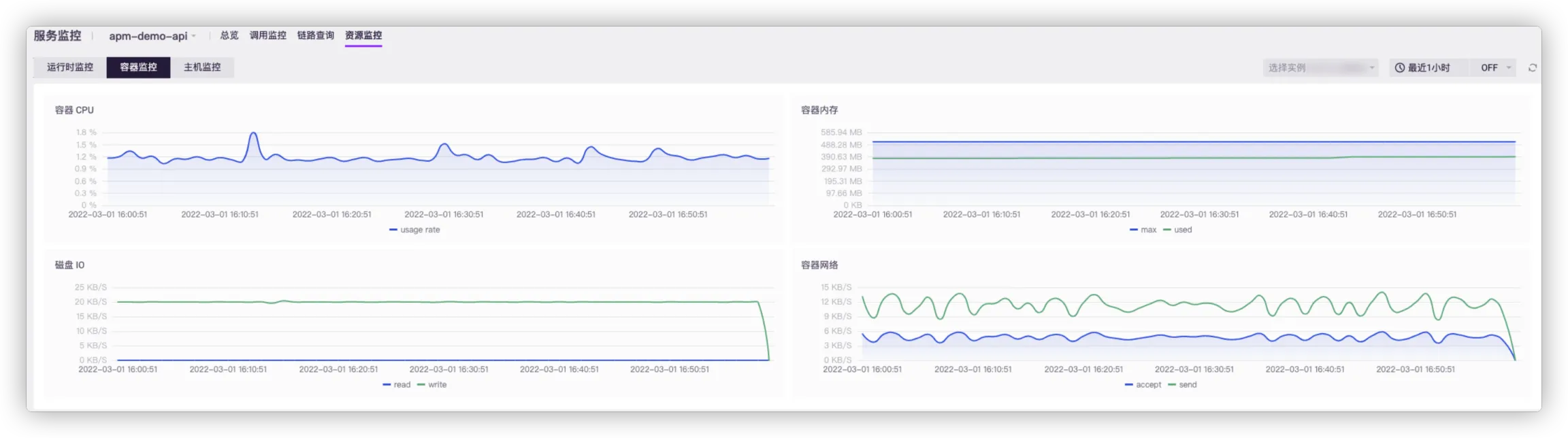 - 磁盘 IO:当前服务实例所在容器的磁盘速率趋势图。