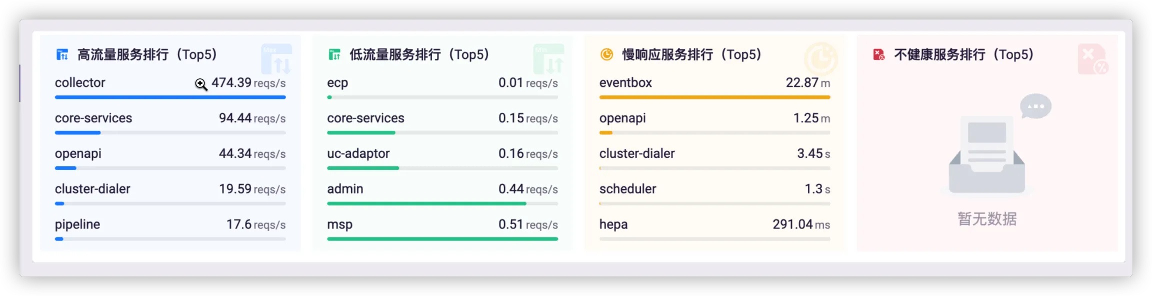 - 低流量服务排行(Top5):一小时内基于服务 RPS 的正序 Top 5。