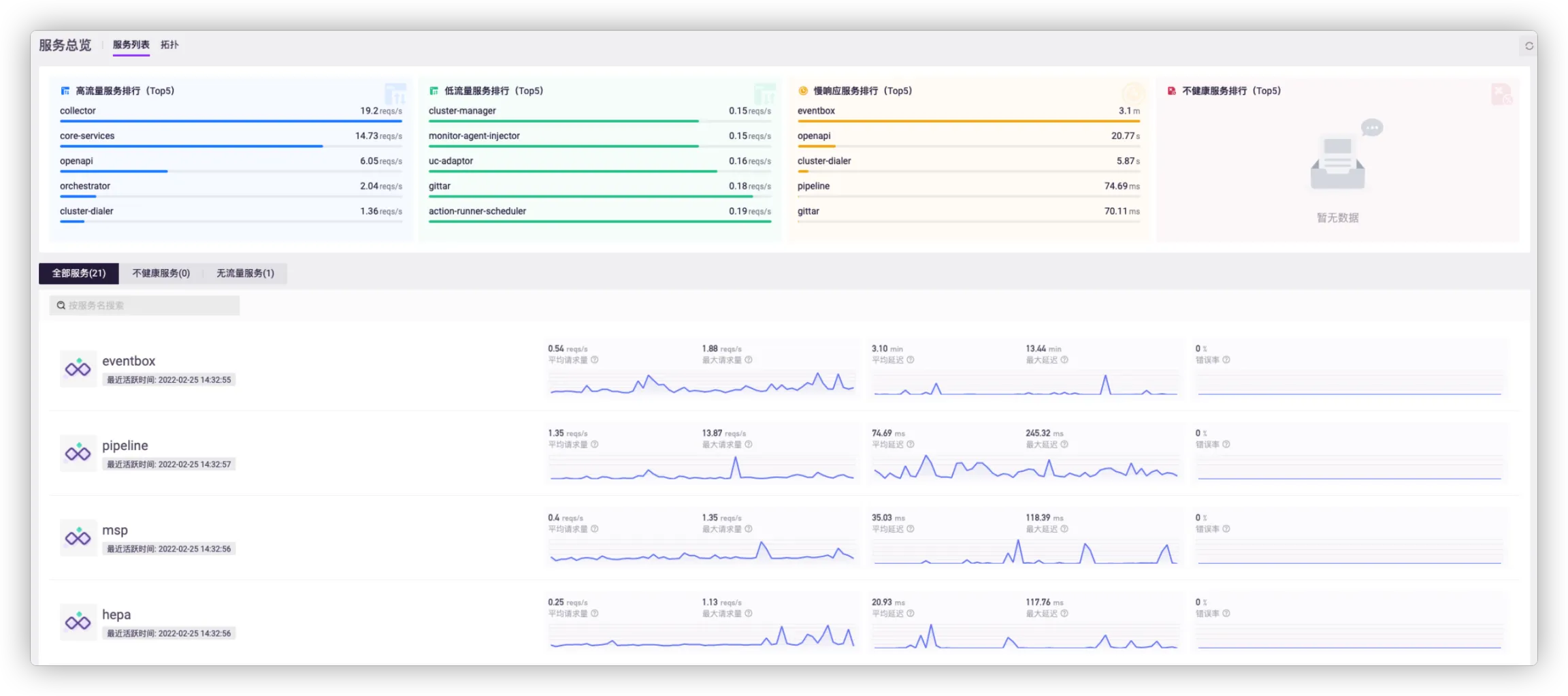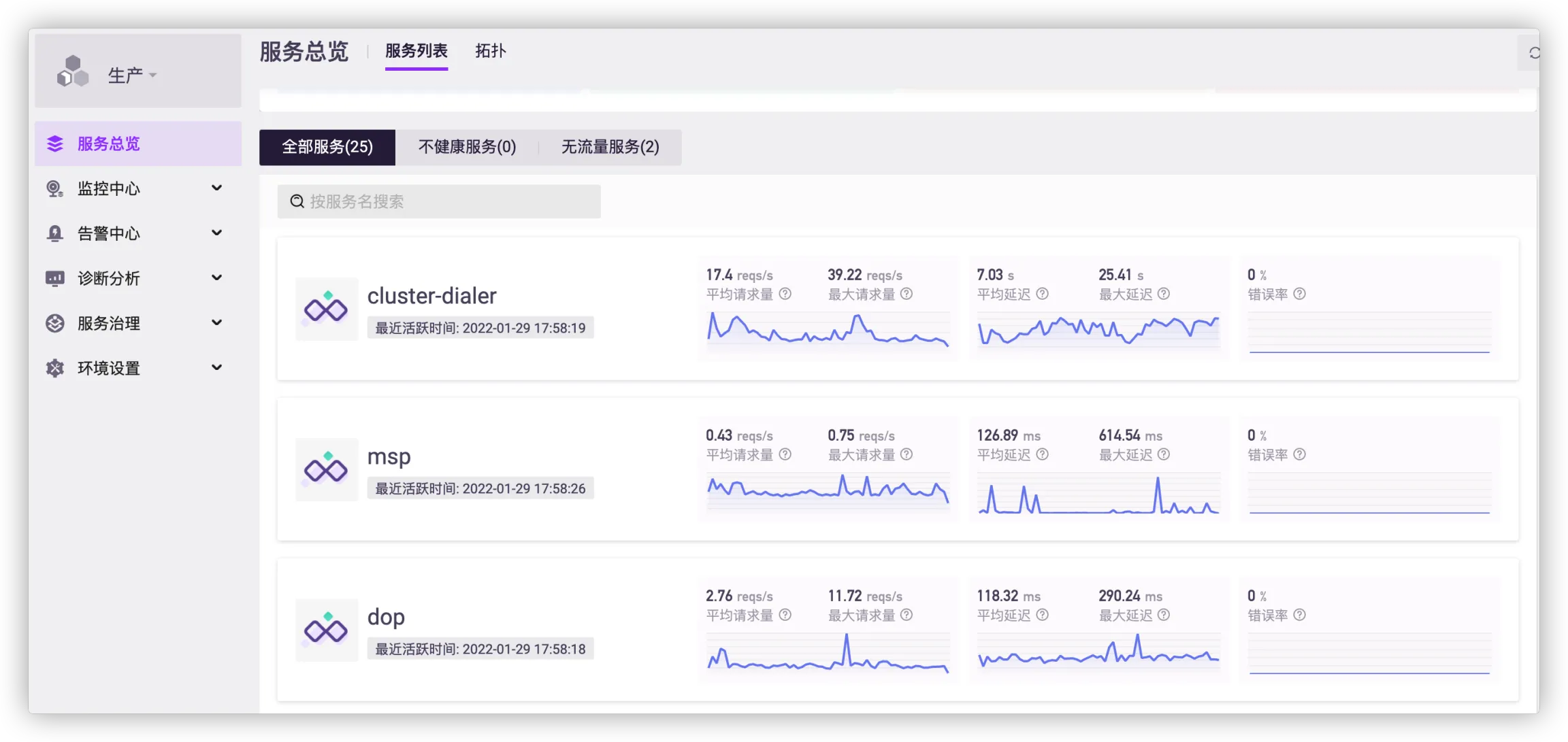 服务总览为您提供服务列表和全局拓扑图,您可在此查看服务的最新状态,实时了解服务的各项指标。
