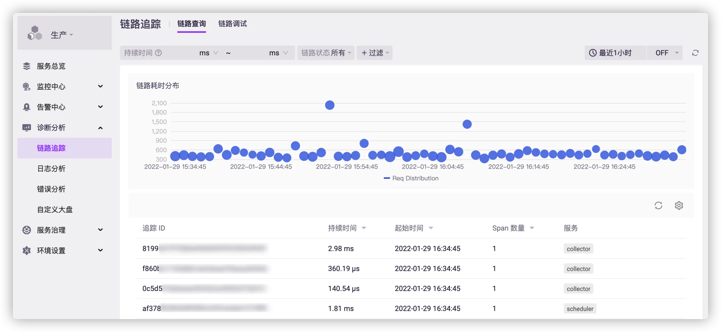 请进入 微服务治理平台 > 诊断分析 > 链路追踪 进行操作。