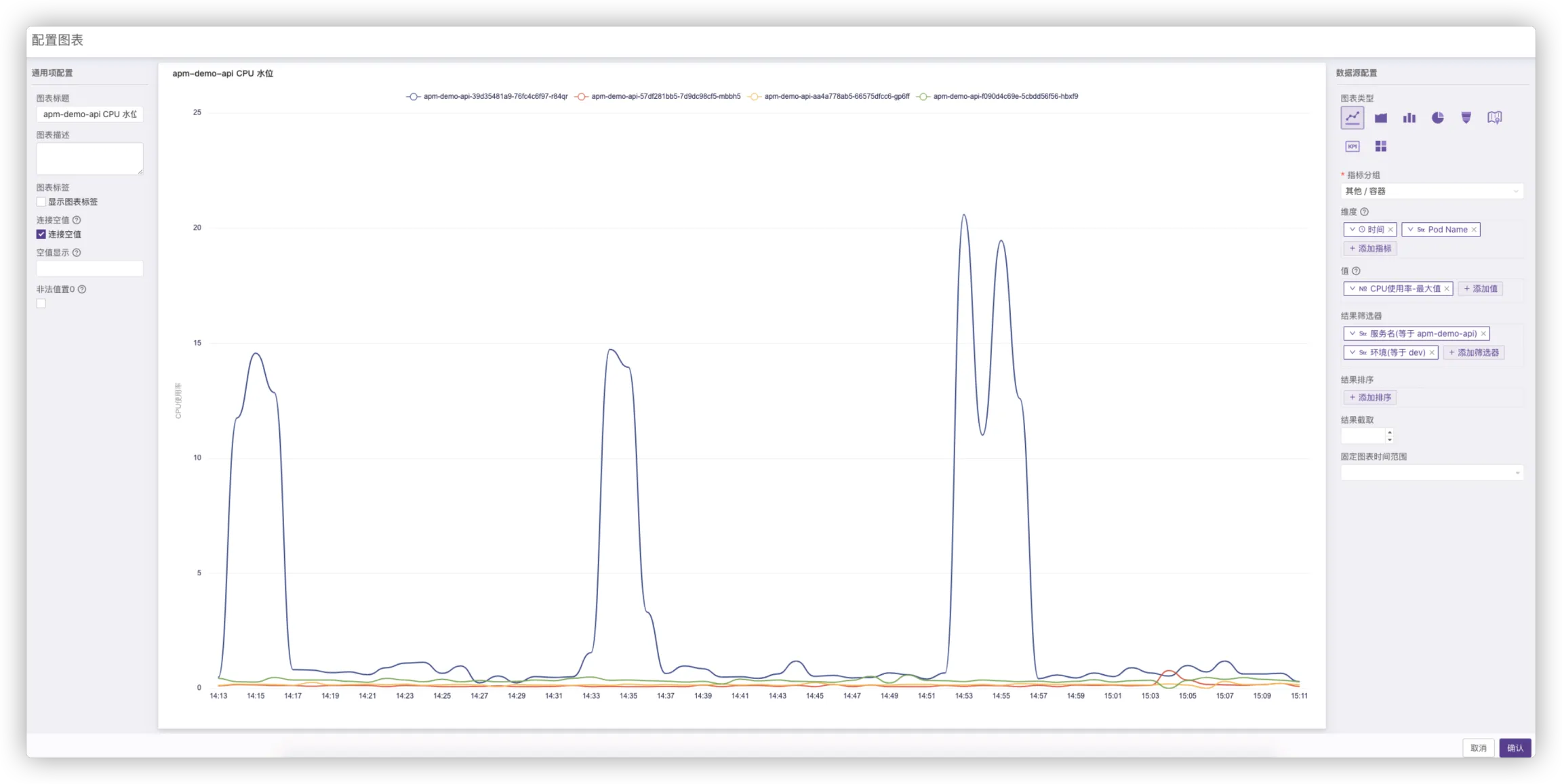 您还可以通过运维大盘配置容器内存及 CPU 水位图表,需注意的是,在压测场景下需多关注 CPU 或者内存的峰值,以通过最大值来获取峰值。