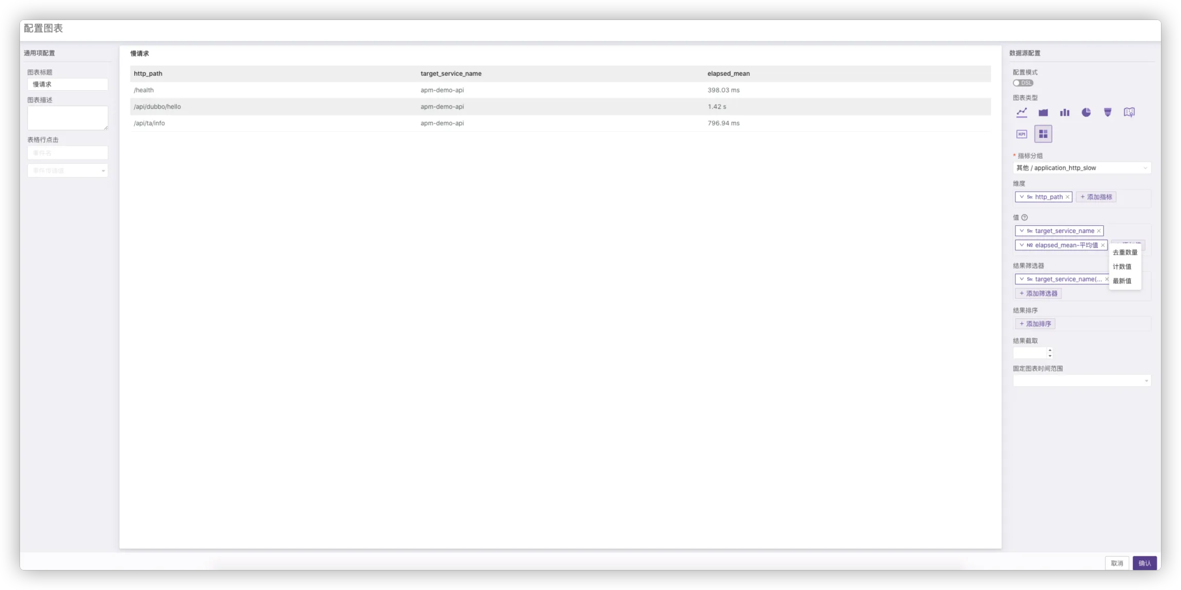 针对慢 SQL,您可在 Erda 大盘中选择表格类型的图表,查看 SQL 语句、SQL 请求的平均时间、SQL 请求的最大时间等信息,相关配置如下图所示: